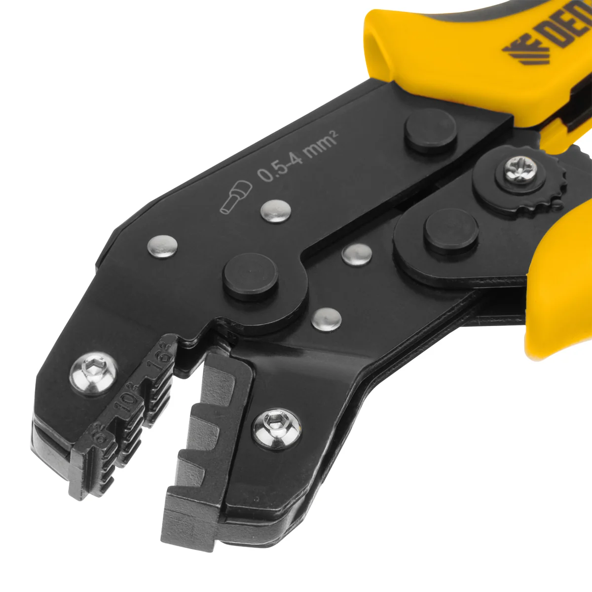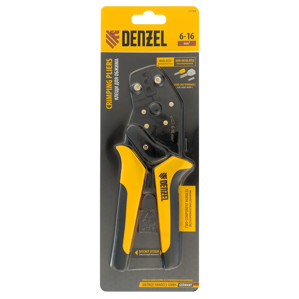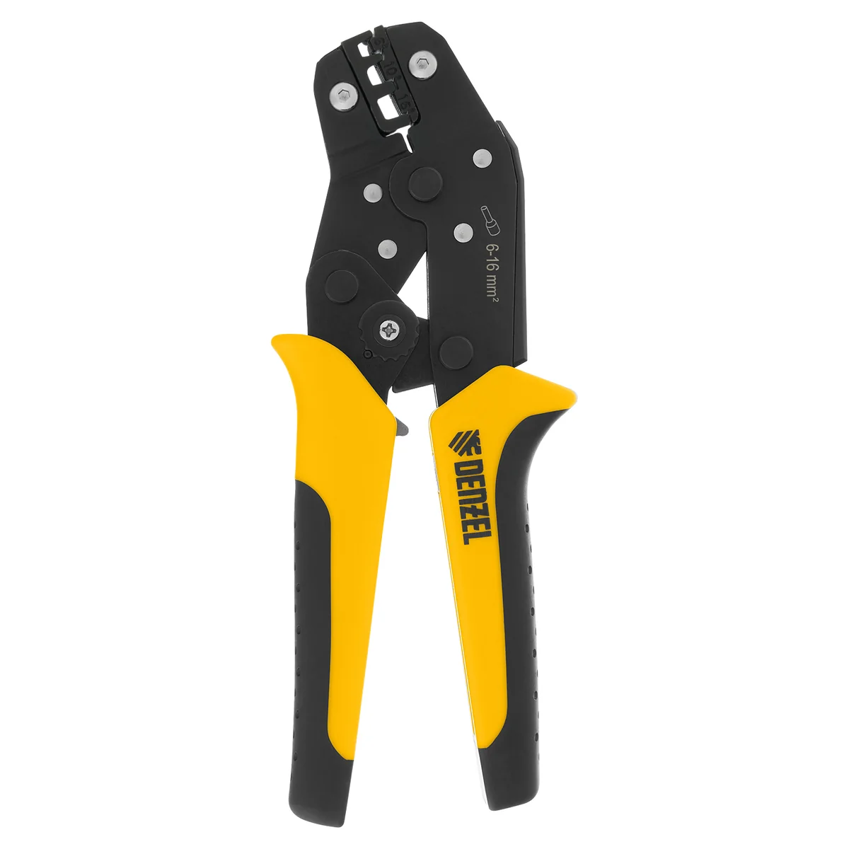 Клещи Denzel 17744 предназначены для обжима наконечников штыревых НШВ, НШВИ, НШВИ-2, сечением 6-16 мм². Двухкомпонентные рукоятки эргономичной формы обеспечивают удобство в работе. Трещоточный механизм позволяет производить соединение до полного обжима.