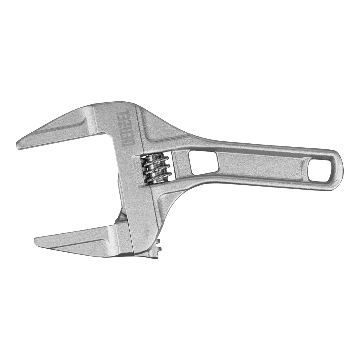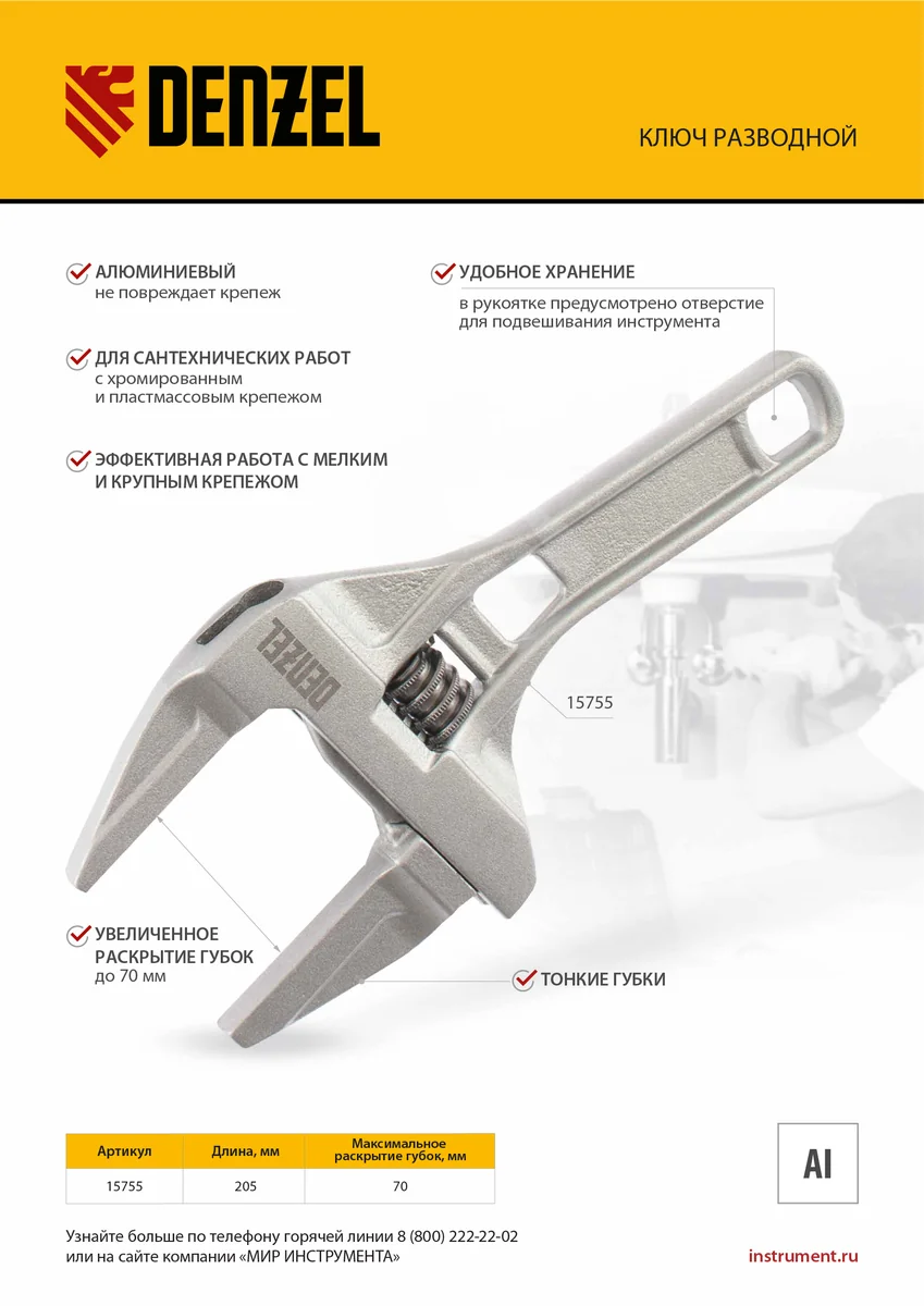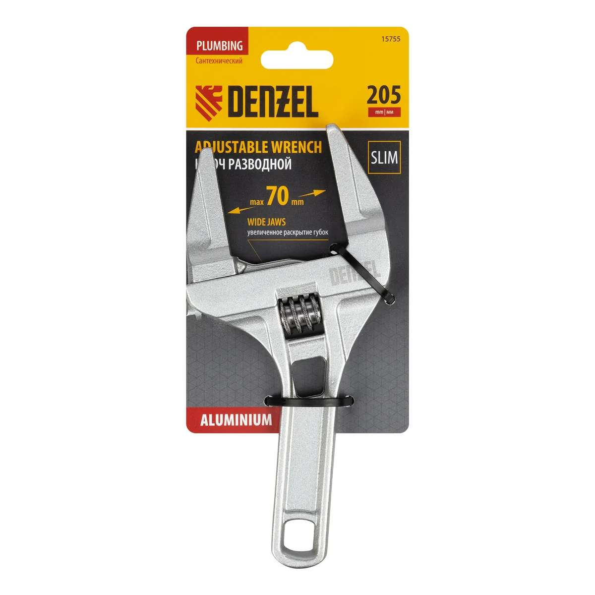 Ключ разводной алюминиевый Denzel 15755 длиной 205 мм, с тонкими губками, оптимален для монтажа и демонтажа хромированных и пластмассовых крепежных элементов. Используется при выполнении сантехнических работ.