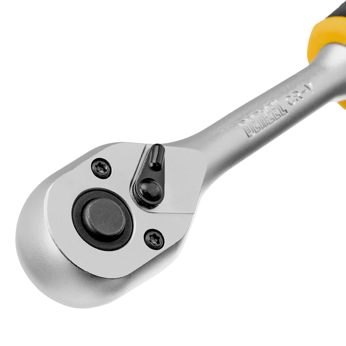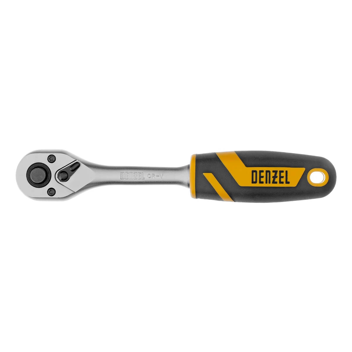 Ключ-трещотка Denzel 14032 из стали CrV, с присоединительным квадратом 3/8", с быстрым сбросом и храповым механизмом с 90 зубьями, предназначен для установки торцевых головок, а также адаптеров и удлинителей с посадочным размером соответствующего размера. Угол поворота трещотки составляет всего 4°, что упрощает работу в труднодоступных местах. Инструмент будет полезен в сервисном центре, на СТО, а также пригодится дома или в поездке.