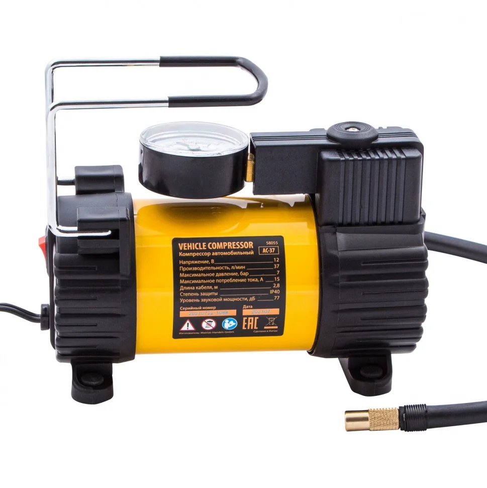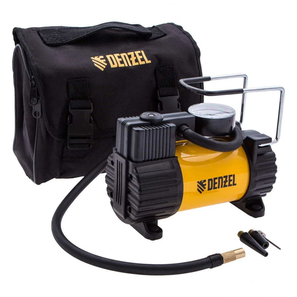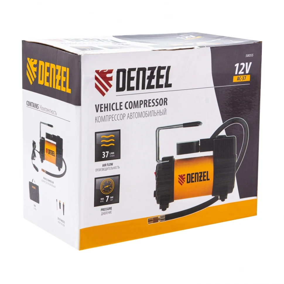 Автомобильный компрессор Denzel AC-37 58055 с автомобильным предохранителем работает от бортовой сети 12 В, обеспечивает давление 7 атмосфер и производительность 37 л/мин. Служит для накачивания шин, резиновых матрацев, надувных лодок и других изделий — для этого предусмотрены различные насадки. Компрессор пригодится в гараже, будет полезен в дальней поездке, а также во время отдыха на природе.ПреимуществаПростое использование — компрессор подключается к прикуривателю и не требует специальных навыков и инструментов.Удобный контроль давления — конструкцией предусмотрен точный аналоговый манометр.Безопасная работа — автомобильный предохранитель защищает бортовую сеть от перегрузок.Компактность и эргономичность — компрессор весит 1,7 кг и снабжен удобной ручкой.Удобное хранение и транспортировка — устройство поставляется в прочной сумке.Гарантия 3 года — надежность компрессора подтверждена производителем.