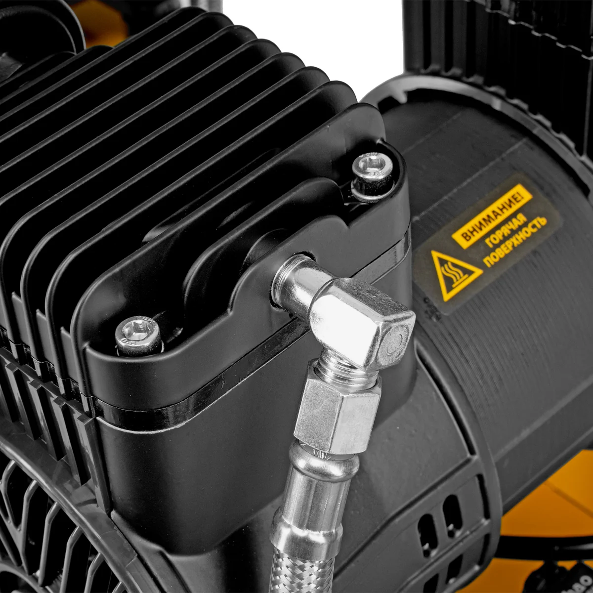 - Мобильность — 3 колеса, в том числе 1 поворотное, и транспортировочная рукоятка упрощают перемещение компрессора по рабочей зоне.