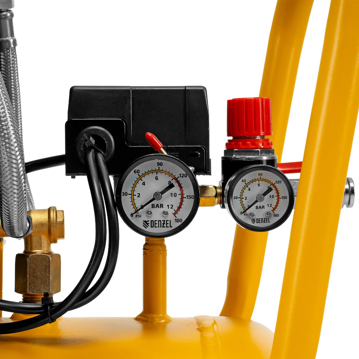 - Удобный контроль работы — компрессор оснащен 2 манометрами для отслеживания давления в ресивере и пневмолинии