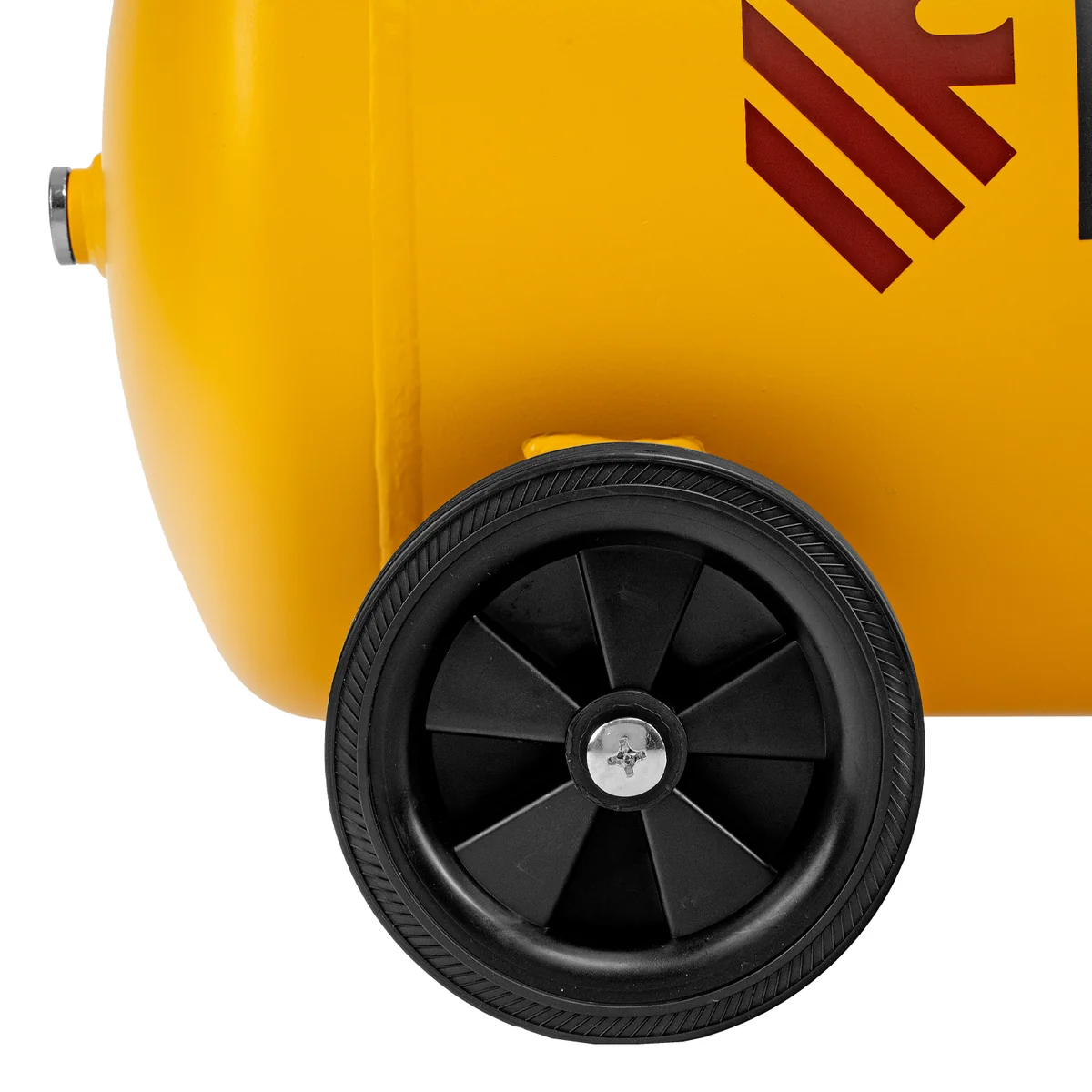 - Мобильность — 2 колеса и транспортировочная рукоятка упрощают перемещение компрессора по рабочей зоне.
