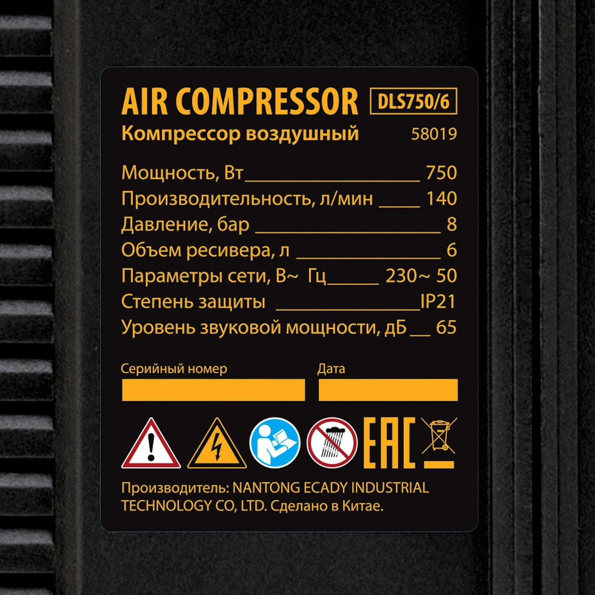 Компрессор DLS750/6 безмасляный малошумный 750 Вт, 140 л/мин,ресивер 6 л Denzel 58019
