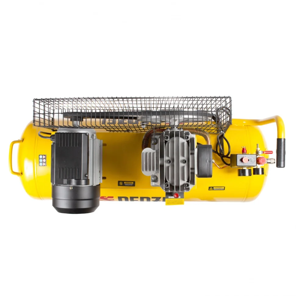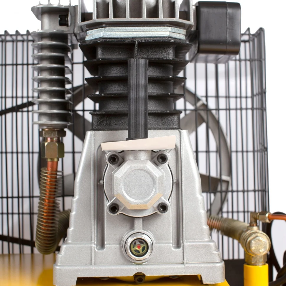 Двухцилиндровая компоновка с большими ребрами охлаждения позволяет добиться быстрого охлаждения компрессора. Цилиндры выполнены из прочного чугуна, что повышает надежность и ресурс изделия.