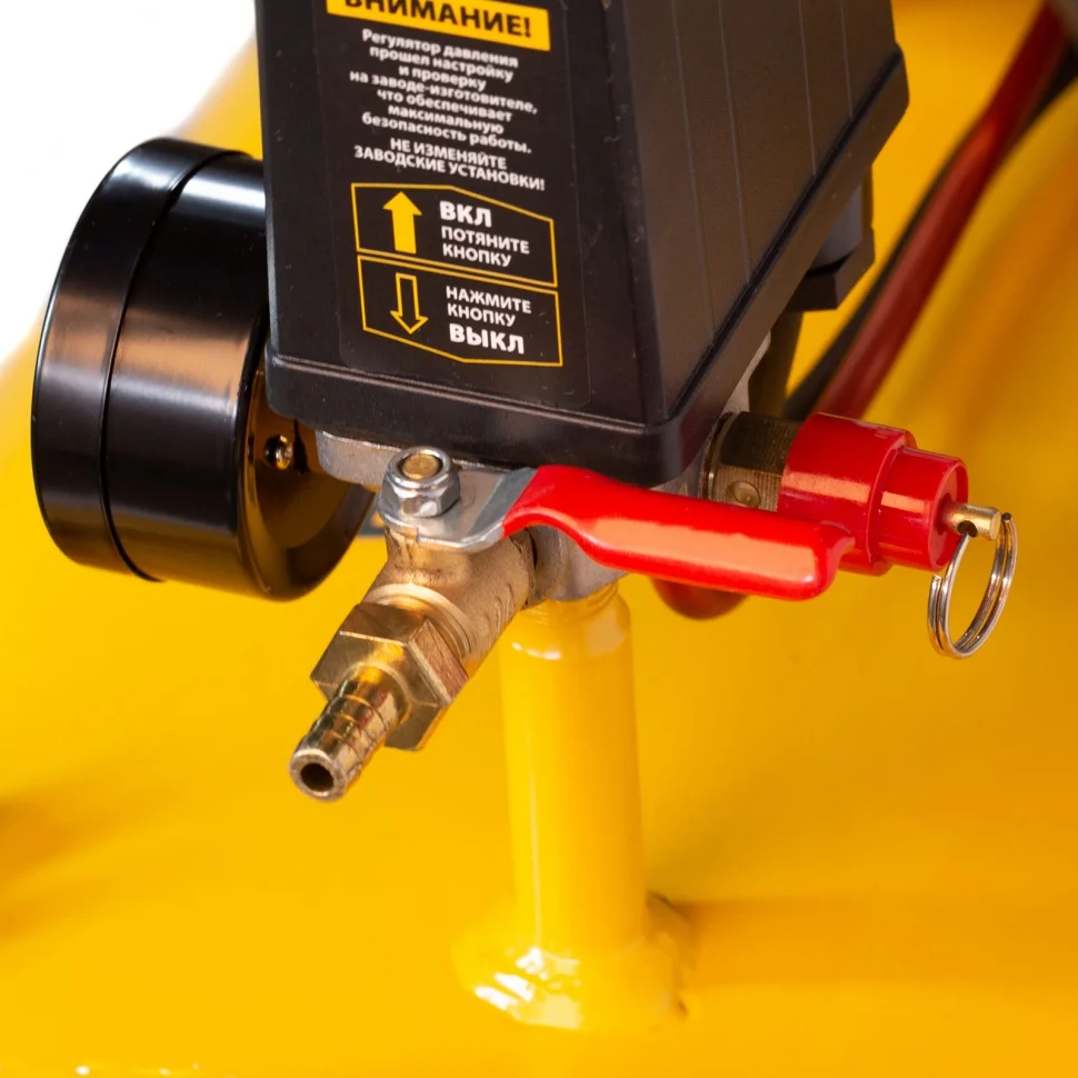 - Клапан для слива конденсата — скопившаяся за день влага и оставшийся воздух быстро удаляются из ресивера, что обеспечивает защиту от коррозии.
