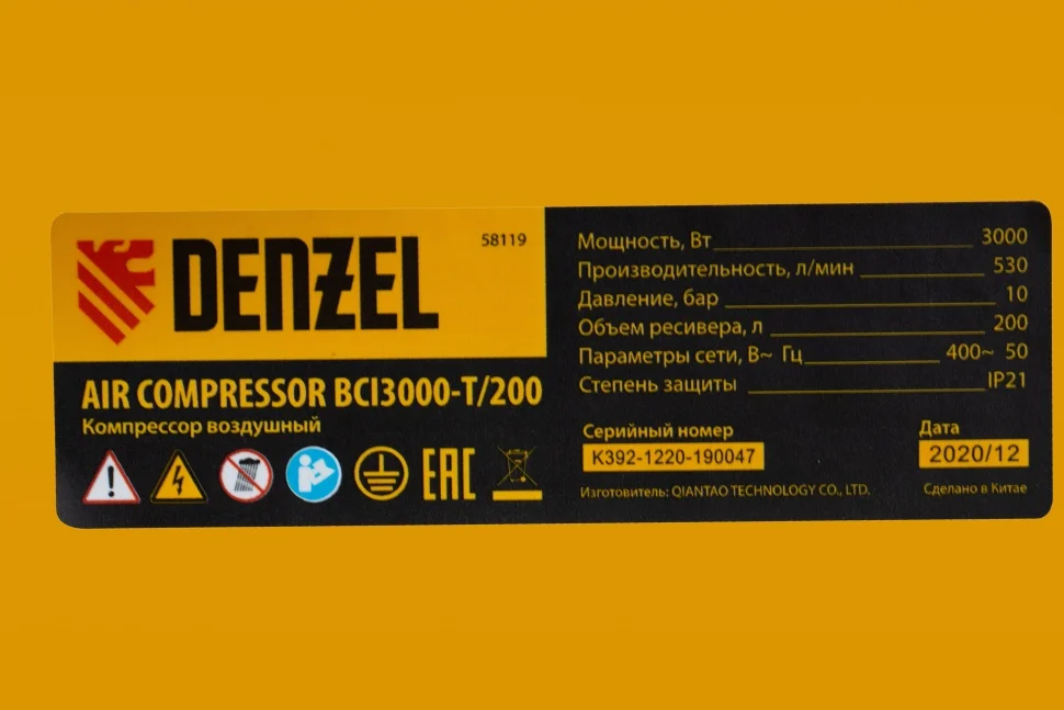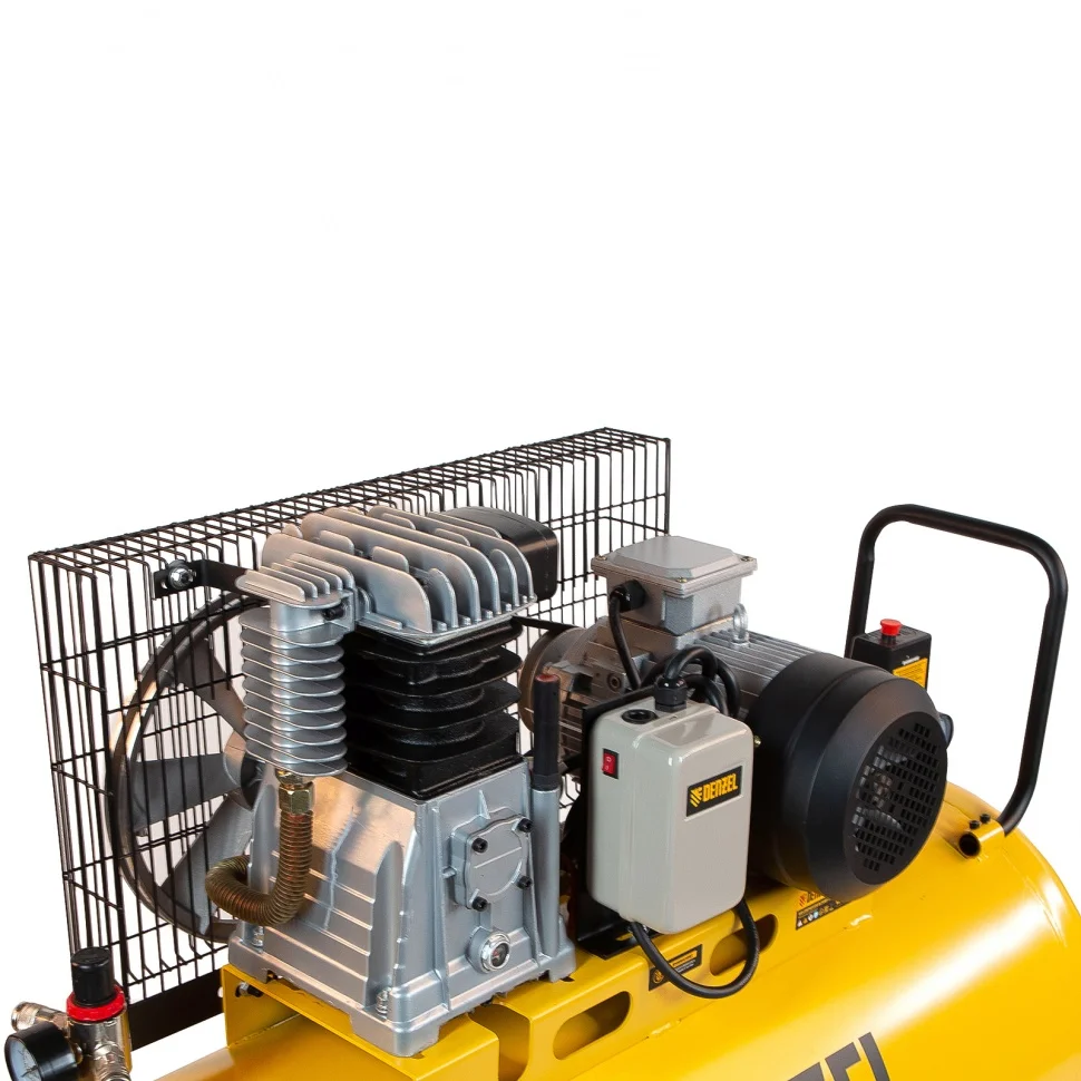 Компрессор воздушный Denzel BCI3000-T/200 58119 мощностью 3 кВт, с ременным приводом, работает со скоростью 530 л/мин, накапливая сжатый воздух в ресивере объемом 200 литров. Оптимально подходит для профессионального применения. Двигатель не боится высоких нагрузок, поэтому компрессор можно использовать на фабриках, в автосервисах, мастерских и при создании магистралей воздухоподачи. При необходимости можно напрямую подключить второй накопитель.