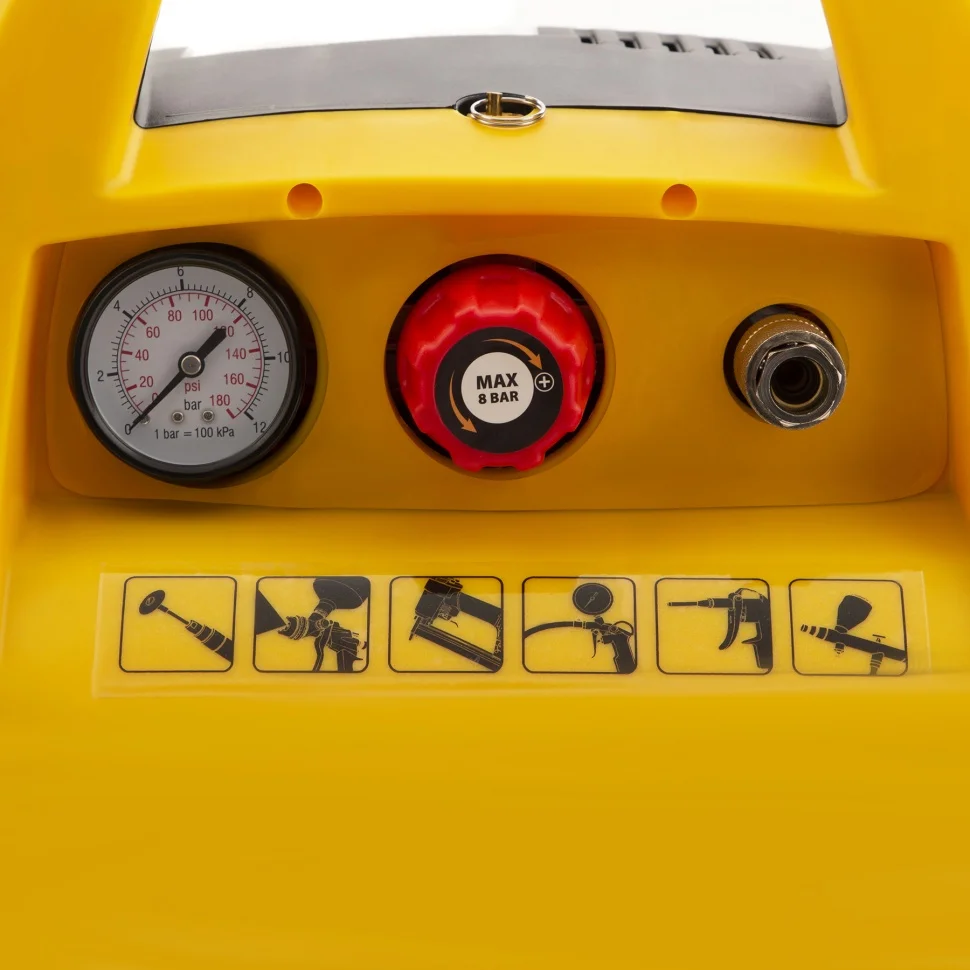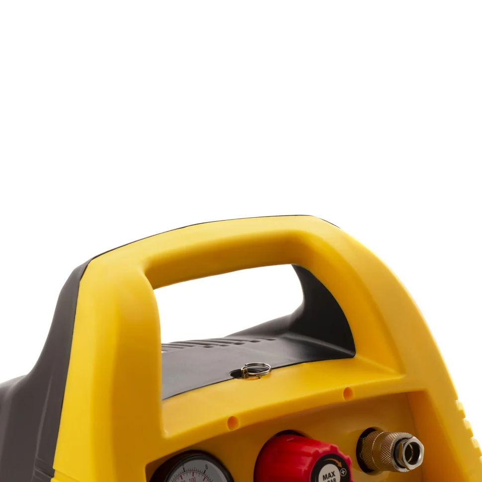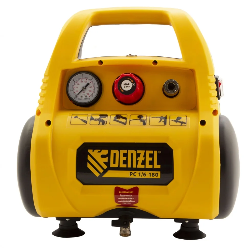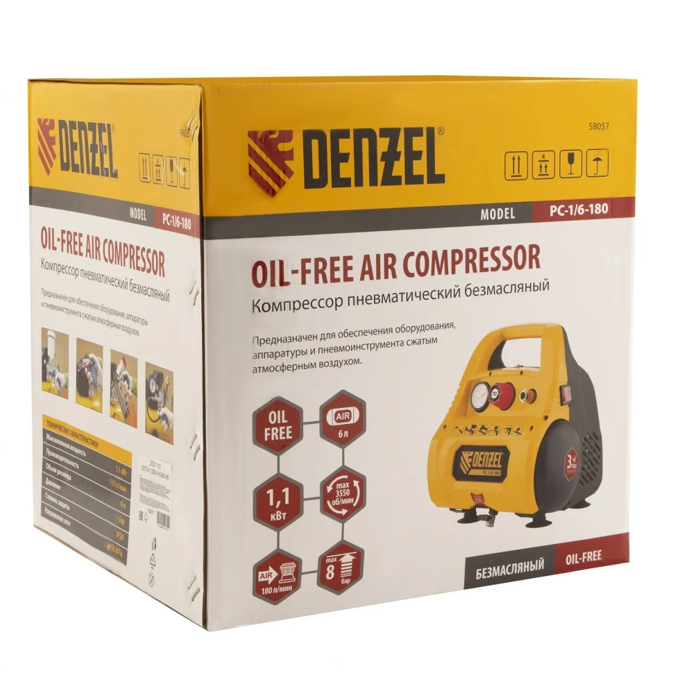 Безмасляный воздушный компрессор Denzel РС 1/6–180 58057 мощностью 1,1 кВт, производительностью 180 л/мин, с ресивером объемом 6 л, подходит для работ, не допускающих попадания масла в воздух. Оптимален для покрасочных работ, накачки шин, продувки компьютерной техники, чистки строительных инструментов.