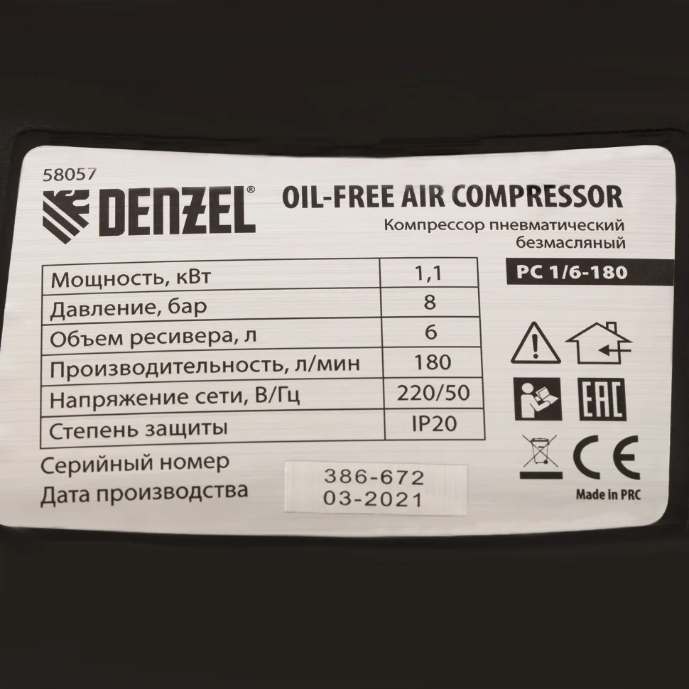 Компрессор воздушный безмасляный РС 1/6-180,1, 1 кВт, 180 л/мин, 6 л Denzel 58057