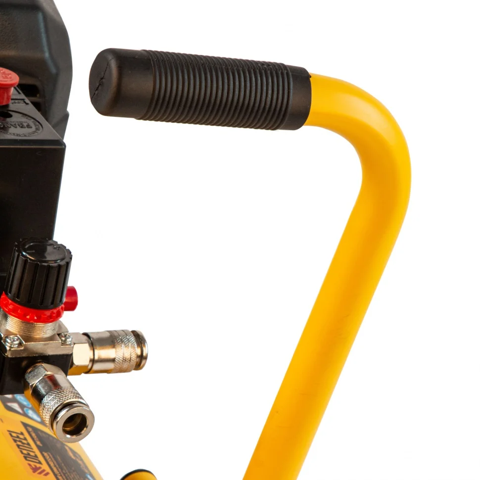 - Мобильность — транспортировочные колеса позволяют легко перемещать компрессор по рабочей площадке.