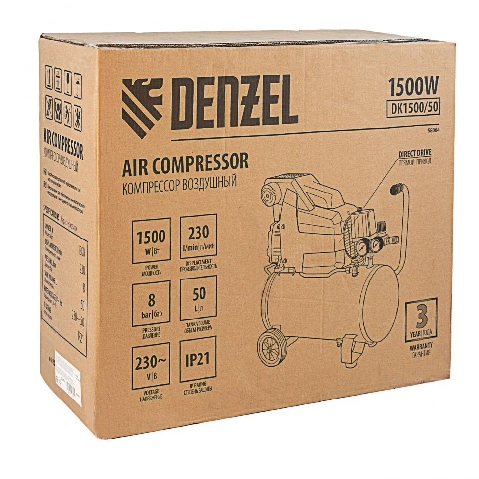 Воздушный компрессор Denzel Х-PRO DK1500/50 58064 мощностью 1,5 кВт, производительностью 230 л/мин, имеет ресивер объемом 50 л и подходит для бытового использования. Обеспечивает подачу воздуха к различным пневматическим инструментам: шуруповерту, краскопульту и др. Будет незаменим в гараже, когда надо подкачать колеса автомобиля или подкрасить его отдельные детали, а также на даче или в частной мастерской. Несмотря на простоту конструкции, компрессор имеет хорошую производительность и возможность подключения сразу нескольких инструментов.