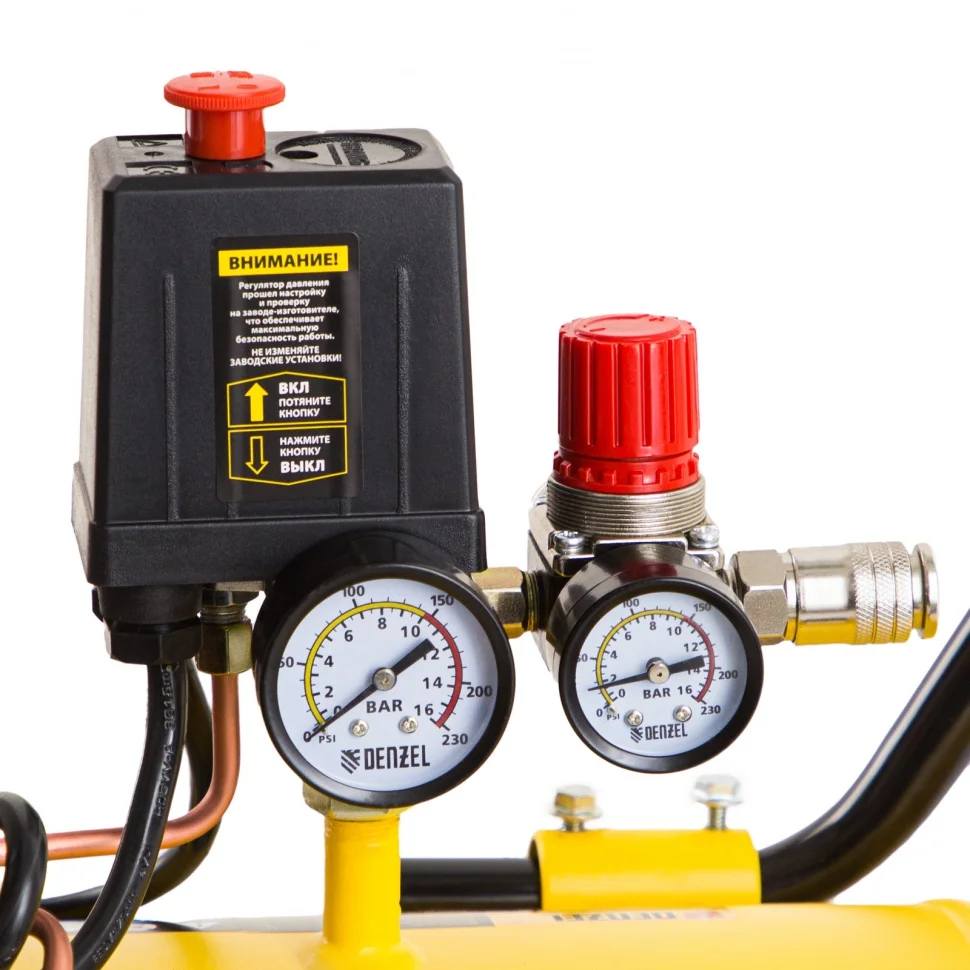 - Удобный контроль работы — 2 манометра позволяют следить за давлением в ресивере и на выходе компрессора.