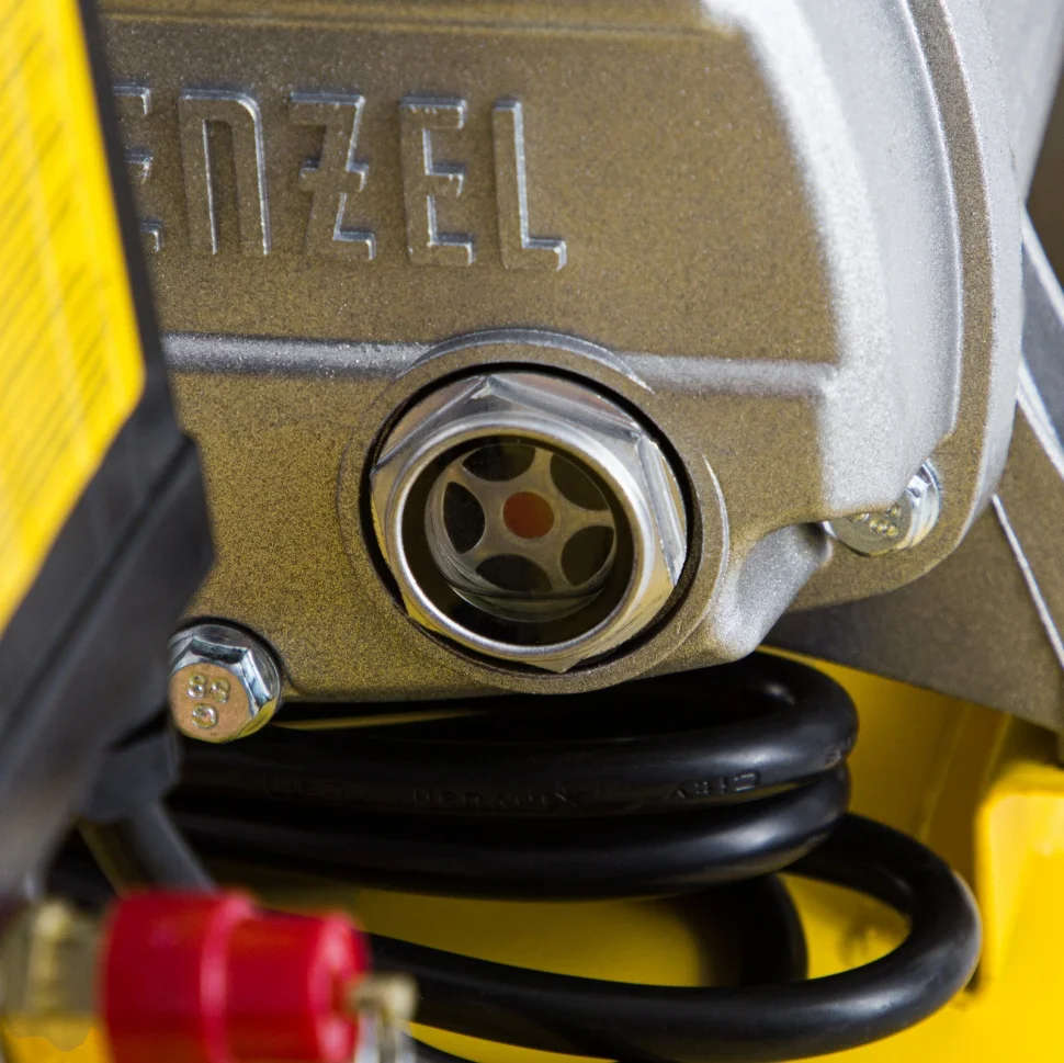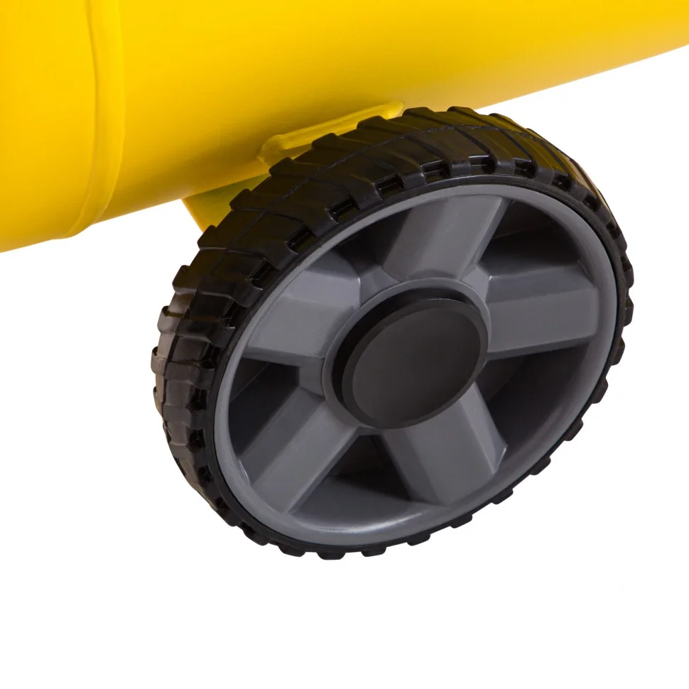 - Мобильность — большие колеса и П-образная ручка позволяют легко перемещать компрессор по рабочей площадке.