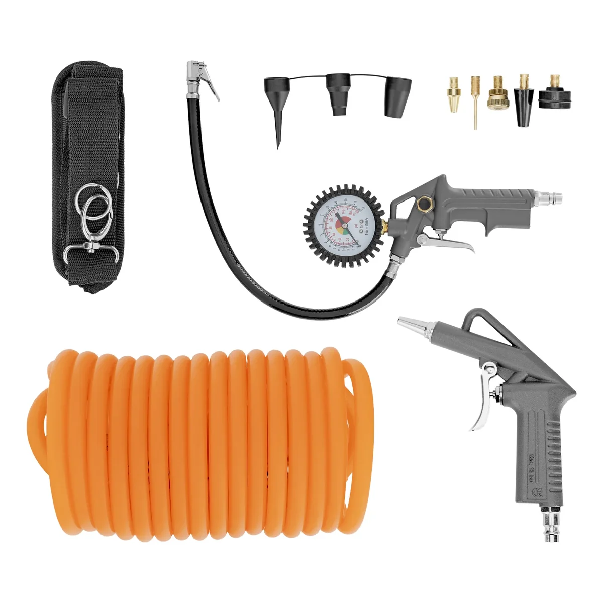- Набор пневмоинструмента в комплекте — к устройству прилагается пистолет для накачивания с манометром, продувочный пистолет, пневматический шланг, а также набор пневмосопел и переходников.