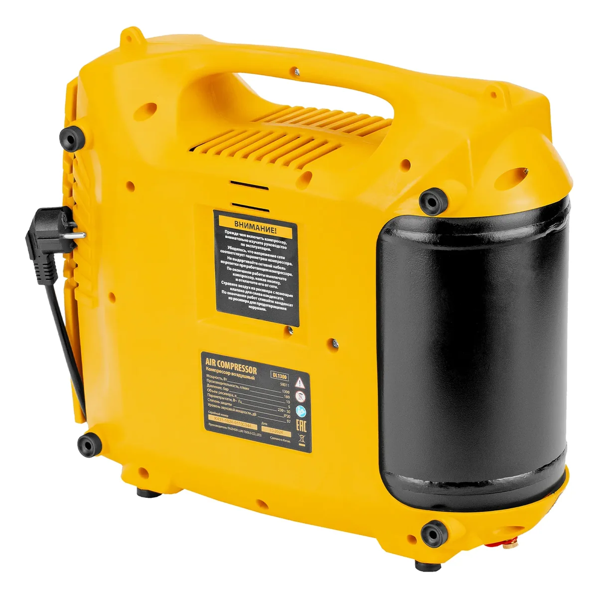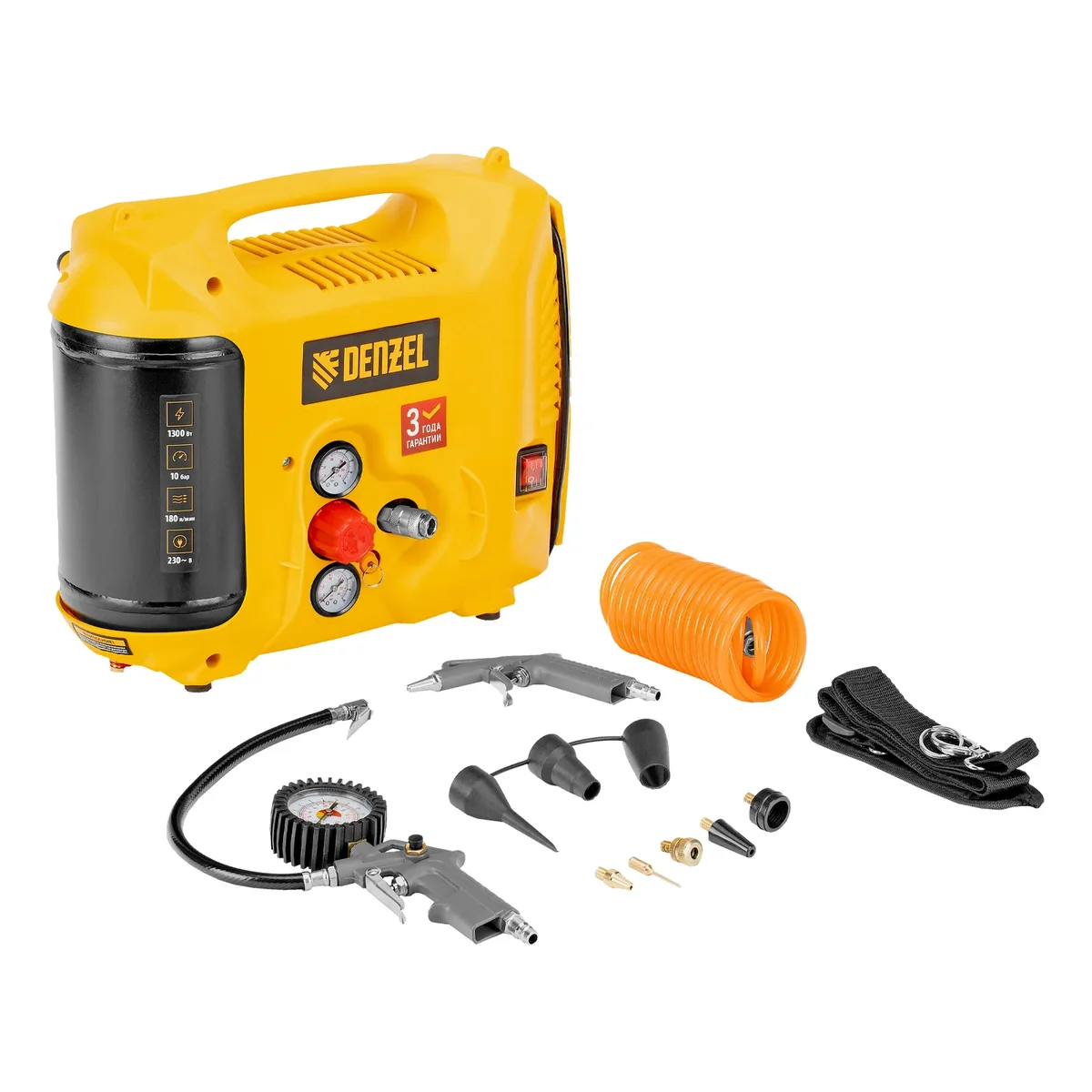 Компрессор воздушный DL1300, 10 бар, 1,3 кВт 180 л/мин 5 л, с набором аксессуаров Denzel 58011