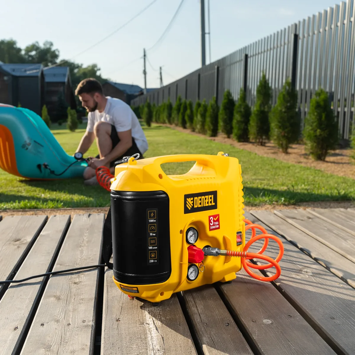 Компрессор воздушный Denzel DL1300 58011 мощностью 1,3 кВт, с максимальным рабочим давлением 10 бар, обеспечивает производительность 180 л/мин и поставляется с набором аксессуаров. Предназначен для обеспечения сжатым атмосферным воздухом нейлеров, степлеров, продувочных пистолетов, окрасочных и мовильных пистолетов и других пневмоинструментов, не требующих большого объема воздуха. Компрессор идеален для накачивания автомобильных шин, лодок, матрасов, мячей и прочих надувных изделий, а также для продувки труб водоснабжения.