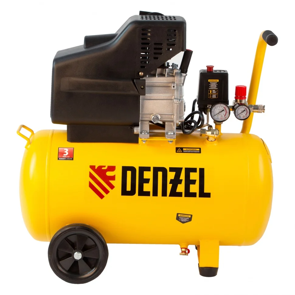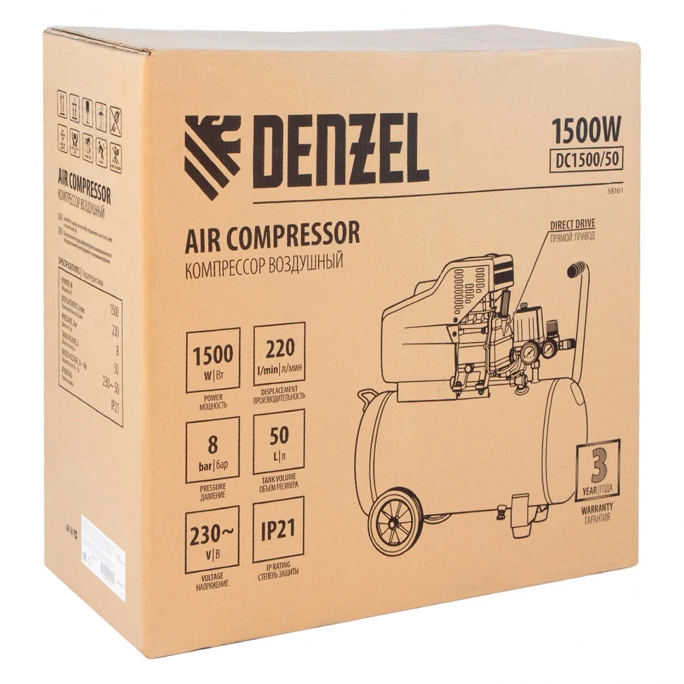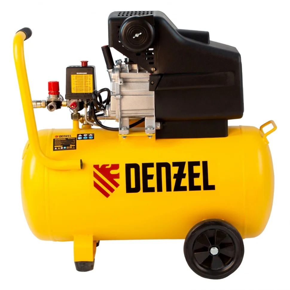 Воздушный компрессор с прямым приводом Denzel DC1500/50 58161 мощностью 1,5 кВт и производительностью 220 л/мин, с объемом ресивера 50 л, используется для подачи сжатого воздуха к пневмоинструменту, например, пневмогайковерту, пневмодрели, пневмостеплеру, пневмозубилу. Благодаря использованию смазочного масла, которое снижает износ деталей, компрессор выдерживает длительную работу и подходит для профессионального применения в автомастерской, гараже или на строительной площадке.