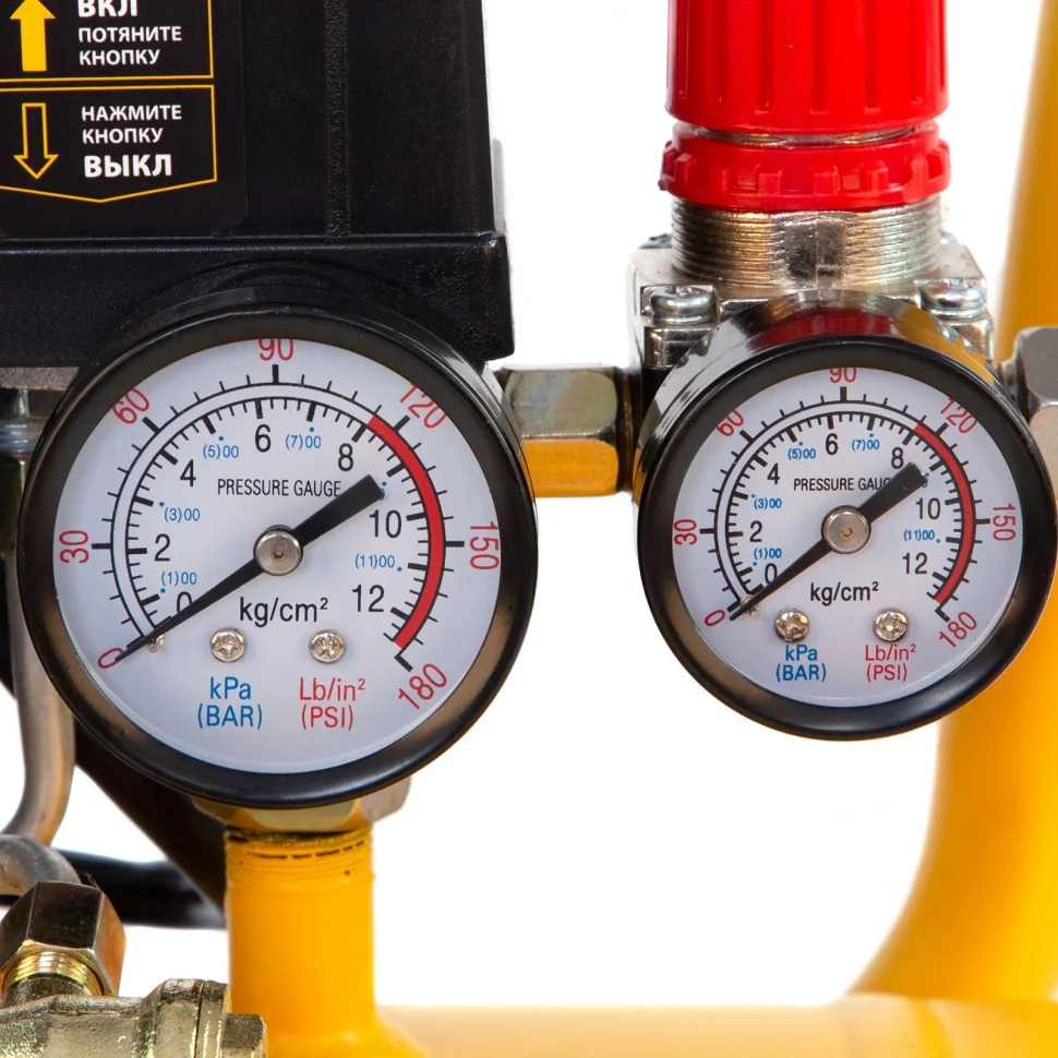 - Два манометра — легко контролировать давление в пневмолинии и в ресивере.