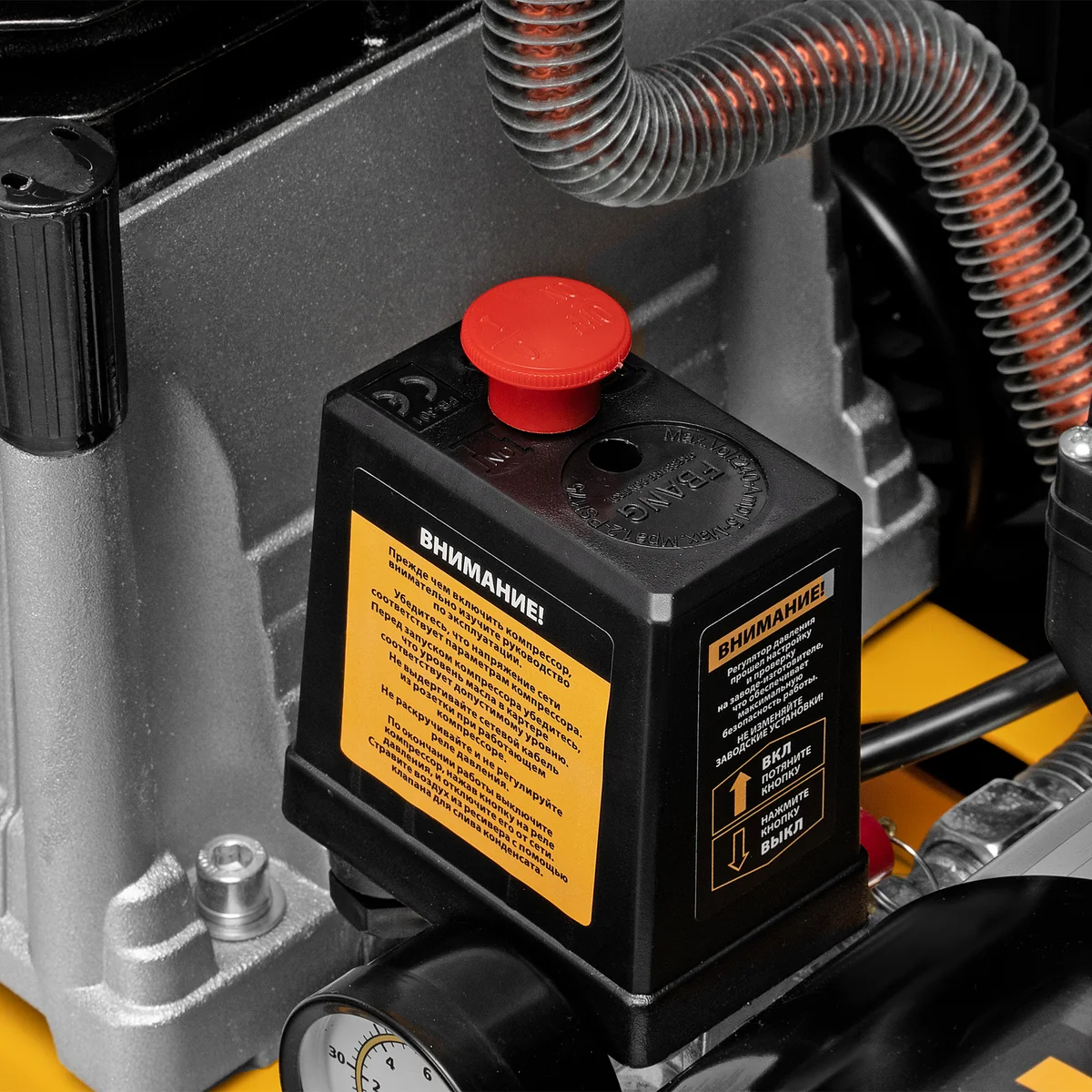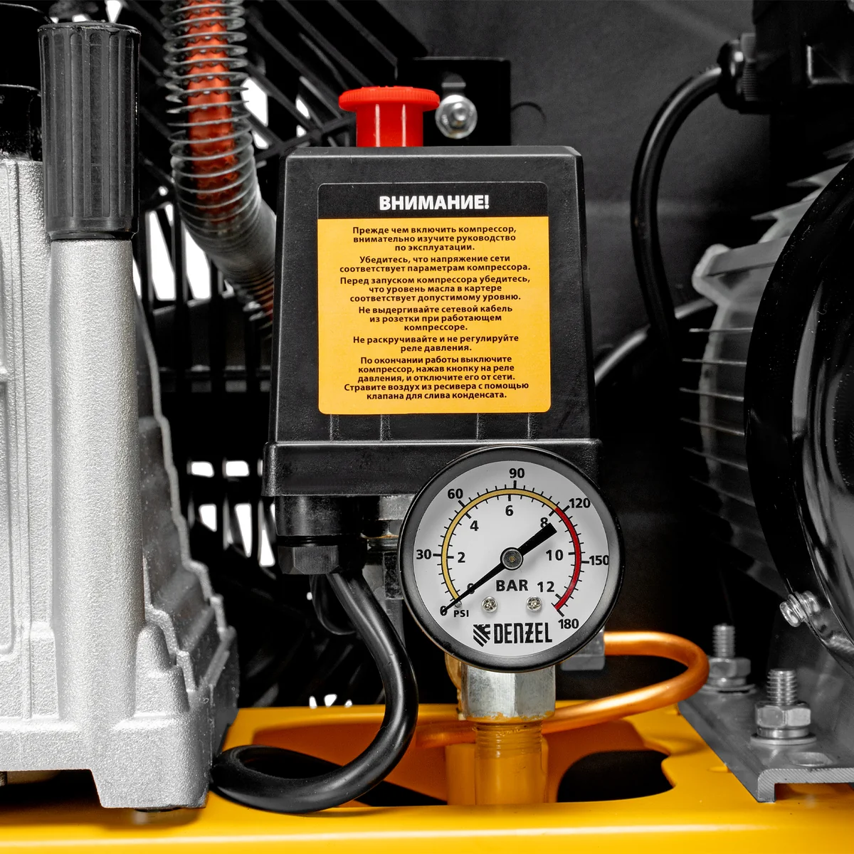 - Автономная работа — прессостат останавливает компрессор по достижении максимального рабочего давления 8 бар и запускает его, если давление падает ниже допустимого уровня.