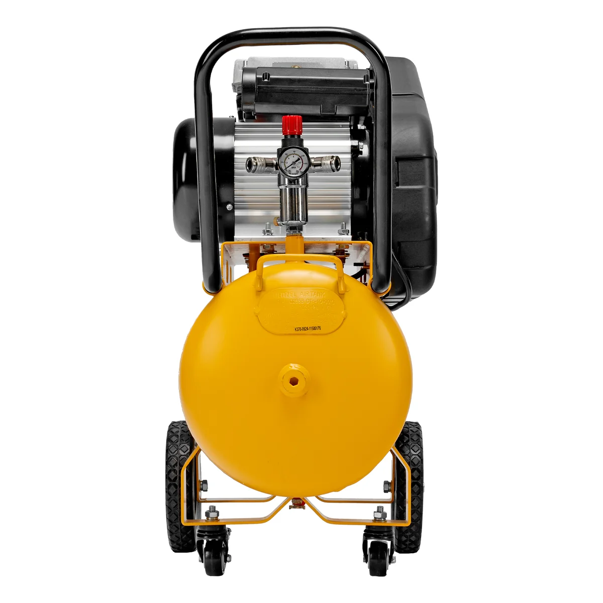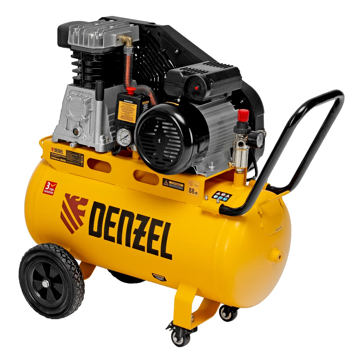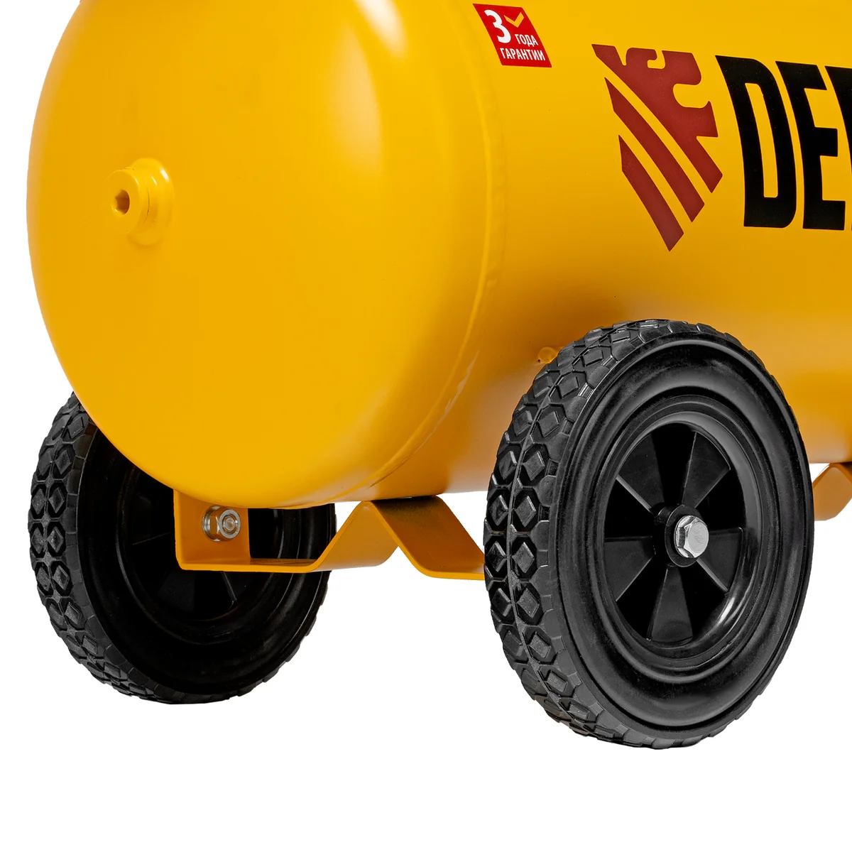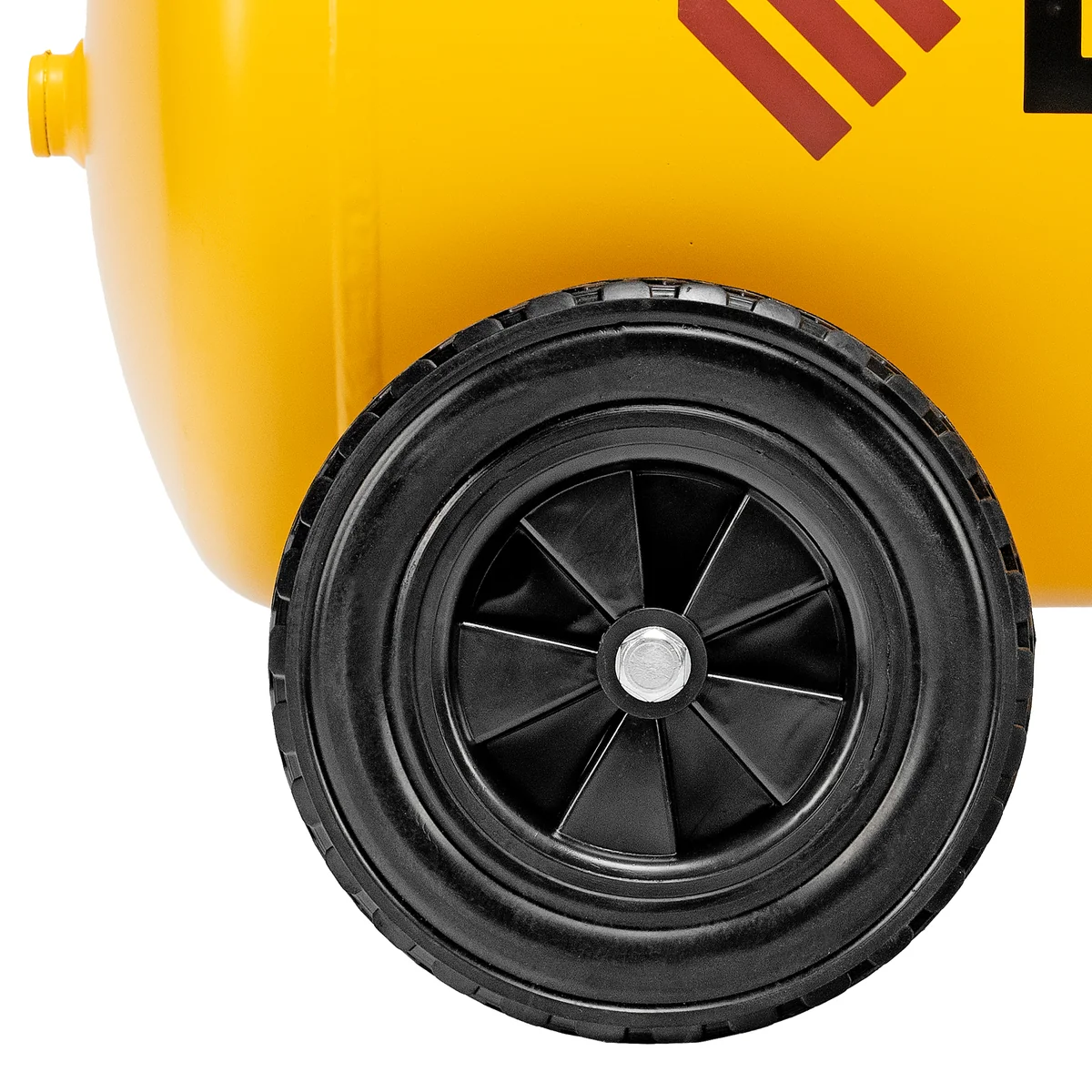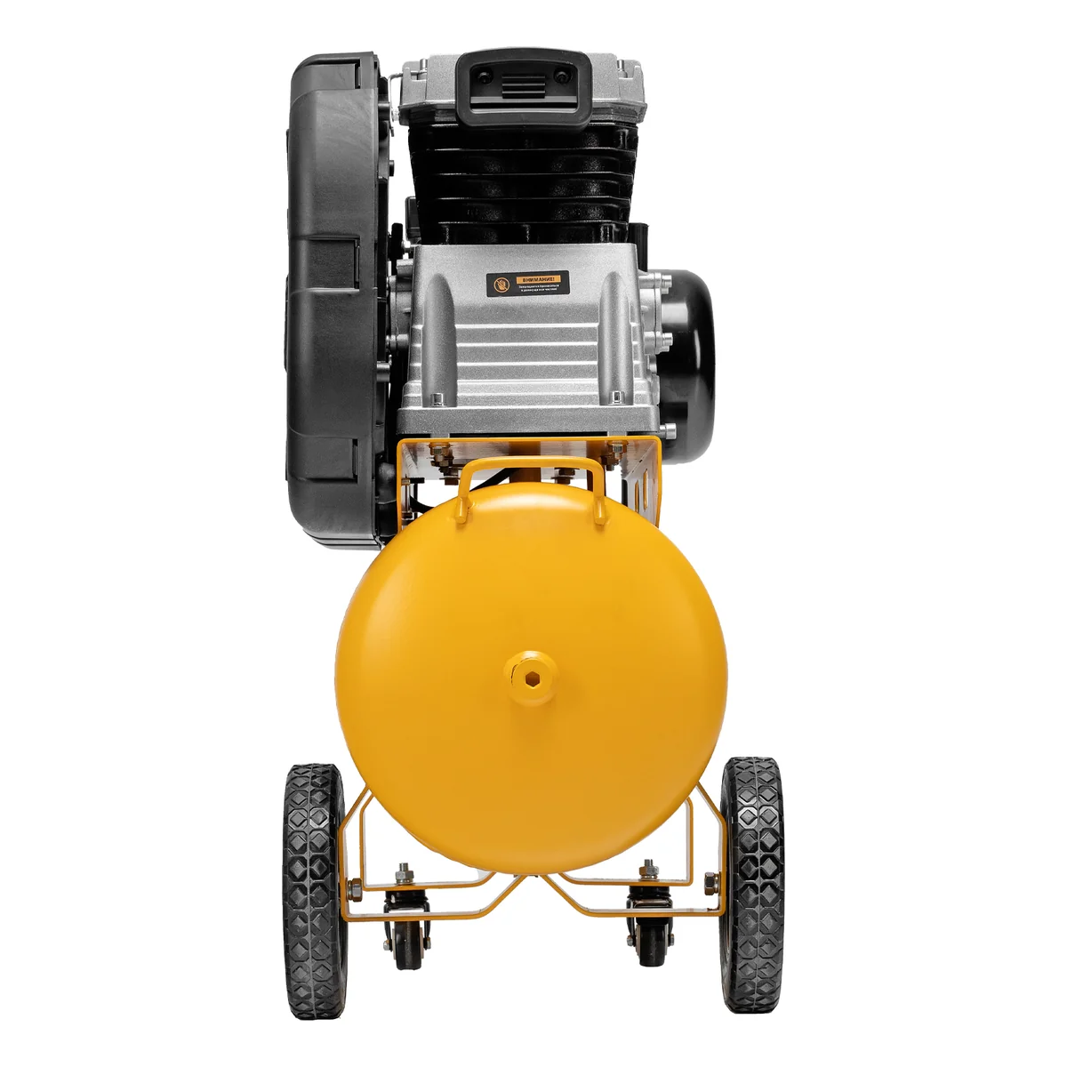 - Удобная транспортировка — на компрессоре установлены колеса, в т. ч. поворотные, и П-образная рукоятка.