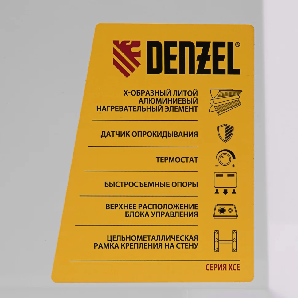 Электрический конвектор Denzel XCE-2000 98117 с Х-образным нагревателем работает от сети 230 В, потребляет мощность 2000 Вт и используется в закрытых помещениях: квартирах, офисах, на производствах, в общественных местах. Благодаря особой форме X-образного нагревательного элемента обеспечивает быстрый и равномерный прогрев помещения до необходимой температуры. Максимальная площадь обогрева составляет 25 кв. м.Преимущества2 режима обогрева (1 и 2 кВт) — обогреватель может использоваться в качестве основного и дополнительного источника тепла.Автоматическая работа — термостат поддерживает заданную температуру.Пожаробезопасность — конвектор мгновенно отключается при опрокидывании и перегреве.Защита пользователя и окружающей обстановки — корпус не нагревается выше 55-60 градусов C, что исключает риск получения ожогов и позволяет располагать конвектор на линолеуме, ламинате, паркете, рядом с гипсокартонными перегородками и деревянными предметами.Эффективная и комфортная работа — Х-образный нагревательный элемент имеет увеличенную площадь контакта с воздухом, не сушит его и не приводит к появлению неприятных запахов.Удобная эксплуатация — в верхней части конвектора расположена простая и понятная панель управления.Быстрая установка — обогреватель монтируется на стену или устанавливается на пол, набор для монтажа входит в комплект поставки.Гарантия 3 года — высокое качество конвектора подтверждено производителем.
