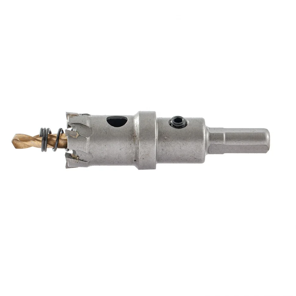 Твердосплавная коронка Denzel 724004, 22 мм, используется для сверлильных работ по черным, цветным металлам, пластику и другим материалам. Твердосплавные зубья легко выдерживают интенсивные нагрузки, поэтому коронка подходит не только для бытового, но и для профессионального применения. Она позволяет просверлить отверстия большего диаметра в сравнении с обычным сверлом.ПреимуществаКоронка изготовлена на высокотехнологичном производстве методом электросварки, поэтому прослужит долгое время.Твердосплавные режущие пластины выполнены из сплава карбид-вольфрама, а корпус - из углеродистой стали, это обеспечивает их прочность и надежность.Режущие пластины твердостью 91-92 HRC и центрирующее сверло из быстрорежущей легированной стали гарантируют высокую скорость и качество засверливания.В конструкции коронки предусмотрена специальная пружина, не допускающая застревания шлама.Благодаря трехгранному хвостовику обеспечивается надежная фиксации коронки без риска прокручивания.