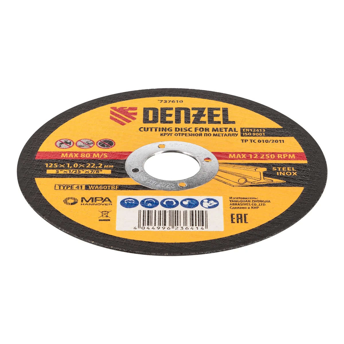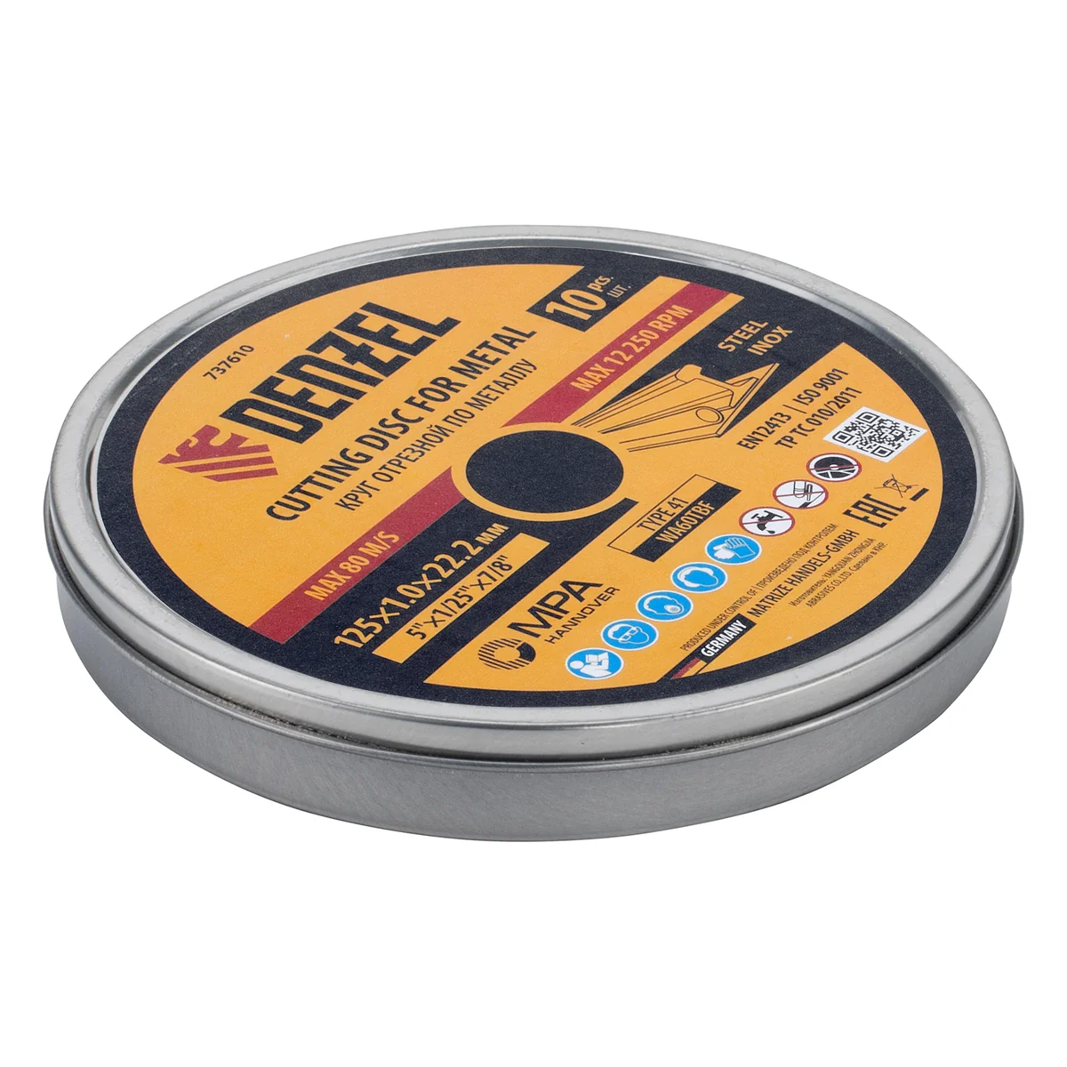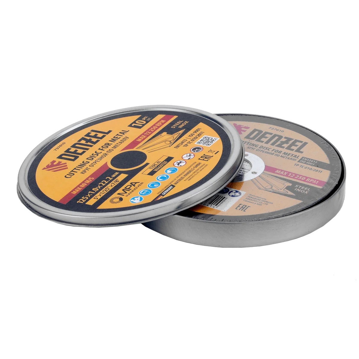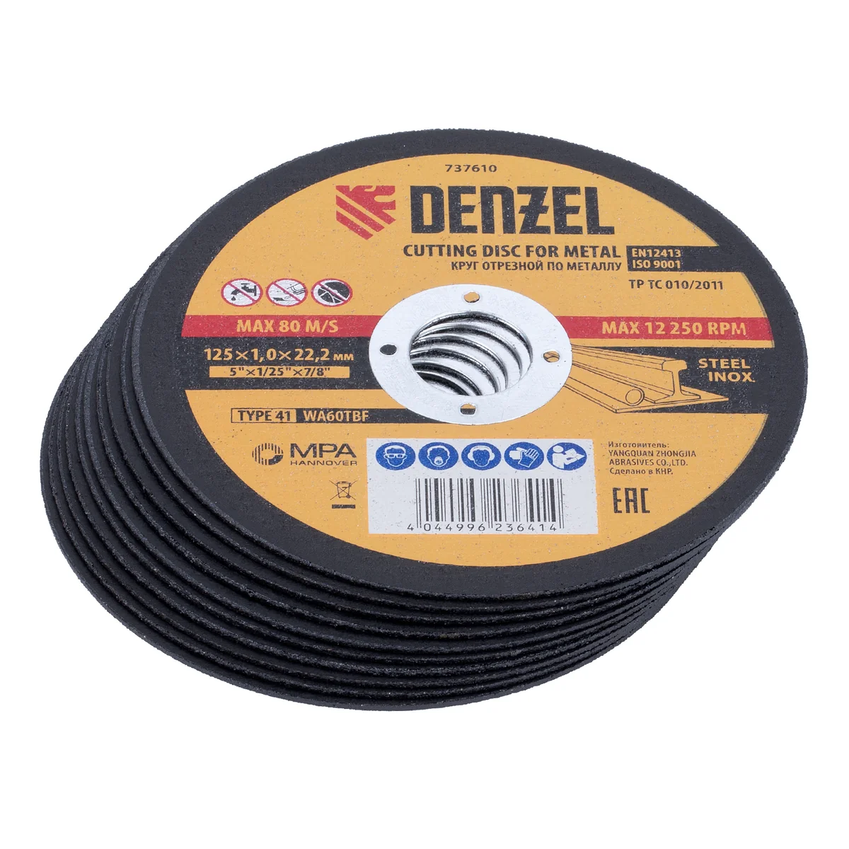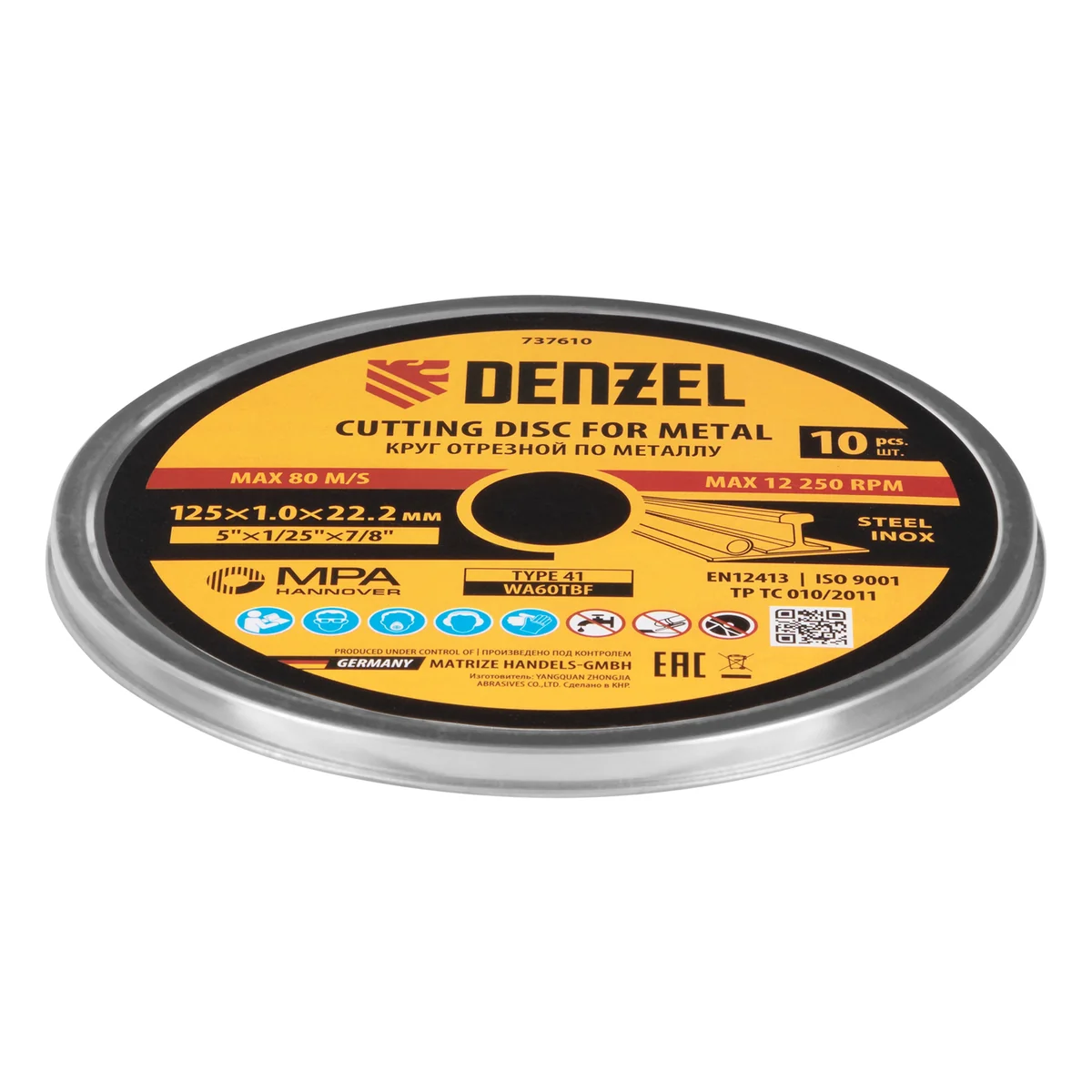 Круг отрезной по металлу Denzel 737610 (WA60TBF) размером 125 х 1,0 х 22,2 мм, 10 шт. в металлической банке, устанавливается на УШМ соответствующего типоразмера. Универсальная оснастка подходит для резки легированных (нержавеющих) и углеродистых (черных) сталей. Набор предназначен для профессионального использования и большого объема работ (сухой рез).