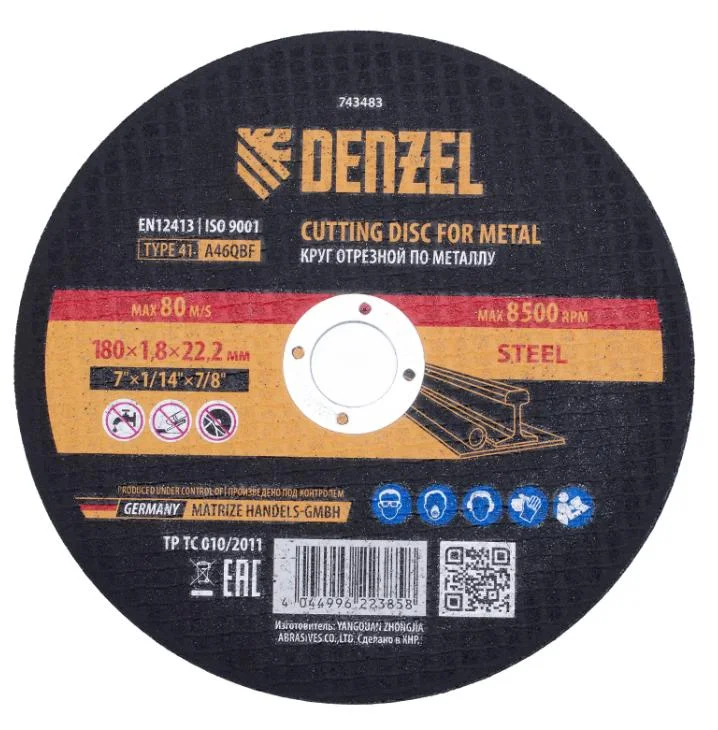 Круг отрезной по металлу Denzel 743483 (A46QBF) размером 180 х 1,8 х 22,2 мм оптимально подходит для реза углеродистых сталей. Используется на УШМ с посадочным диаметром 22,2 мм. Круг рассчитан на профессиональное и бытовое использование, сухой рез.