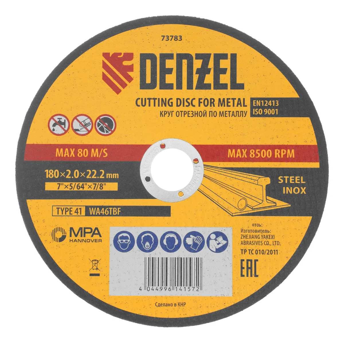 Отрезной круг по металлу Denzel WA46TBF 73783 диаметром 180 мм и толщиной 2,0 мм устанавливается на углошлифовальную машину с посадочным размером 22,2 мм. Предназначен для интенсивного сухого резания углеродистой и нержавеющей легированной стали. Максимальная частота вращения составляет 8500 об/мин. Круг можно использовать не только в быту, но и для решения профессиональных задач.
