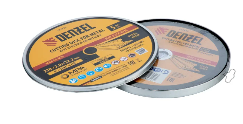 Круг отрезной по металлу Denzel 737920 (A36TBF) размером 230 х 2,0 х 22,2 мм, 5 шт. в металлической банке, устанавливается на УШМ соответствующего типоразмера. Универсальная оснастка подходит для резки легированных (нержавеющих) и углеродистых (черных) сталей. Набор предназначен для профессионального использования и большого объема работ (сухой рез).