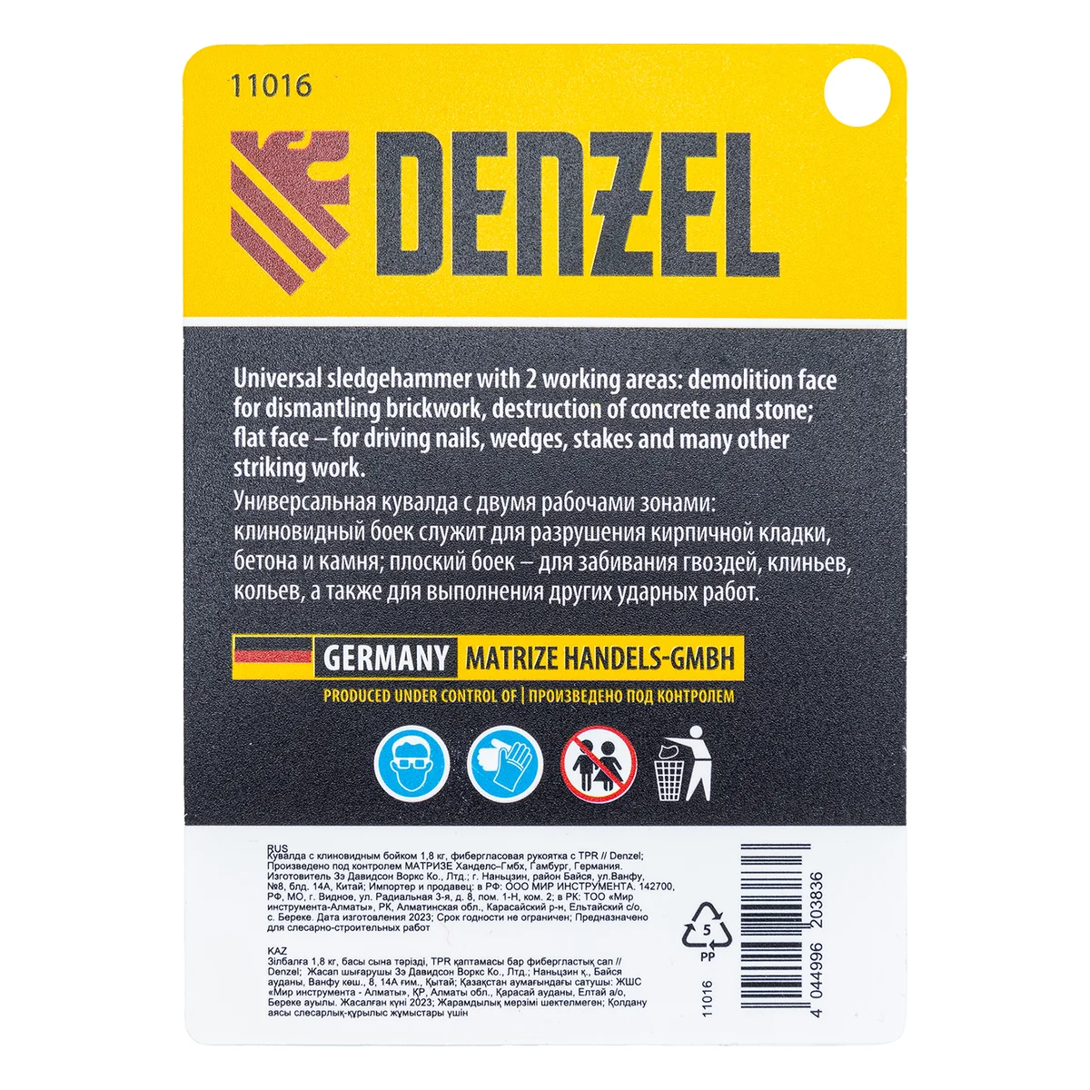 Кувалда Denzel 11016 с клиновидным бойком весом 1,8 кг и фибергласовой рукояткой с TPR-покрытием предназначена для нанесения ударов. Две рабочие зоны делают ее универсальной в работе: клиновидный боек позволяет разрушать кирпичную кладку, конструкции из бетона и камня, а плоский боек — забивать большие гвозди, колья, клинья и выполнять другие ударные работы. Инструмент также подходит для сгибания и придания формы металлическим деталям. Используется при проведении слесарных, строительных и кузовных работ, подойдет и для бытового применения.