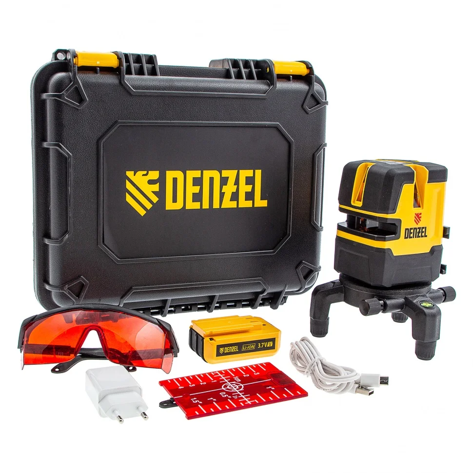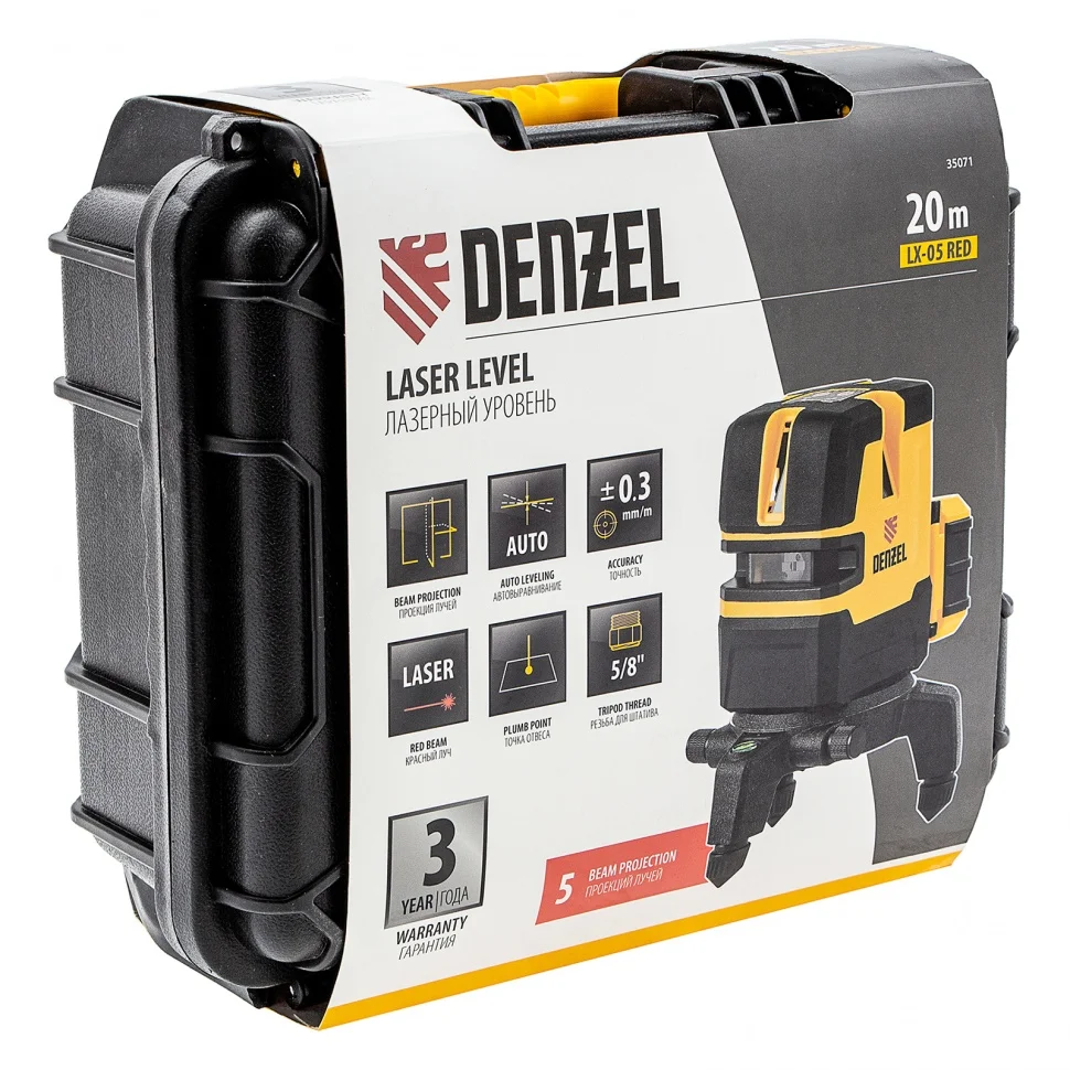 Лазерный уровень Denzel LX 05 Red 35071 предназначен для построения линий разметки на стенах, полу и потолке при проведении строительно-ремонтных работ. Благодаря длине волны лазера 635 Нм дальность проецирования уровня составляет 20 м. Уровень проецирует на поверхности точку отвеса, 4 вертикальных и 1 горизонтальную линию. Функция автоматического выравнивания имеет высокую точность ±0,3мм/м. Угол развертки прибора составляет 240 градусов.ПреимуществаВысокая точность работ — встроенный пузырьковый уровень позволяет выровнять прибор перед включением, а в случае превышения угла наклона срабатывает световое оповещение.Настройка луча — благодаря микрометрическому винту линии разметки можно корректировать вручную.Управление лазерами — есть возможность поочередного отключения лазеров, что обеспечивает экономию заряда, а неиспользуемые лучи не отвлекают в процессе работы.Легкое наведение луча — благодаря поворотному основанию удобно создавать лазерную плоскость.Безопасная транспортировка — маятник лазера можно зафиксировать, чтобы не повредить при перемещении.Резьба под штатив 5/8 дюйма — лазерный уровень удобно использовать при работах на разной высоте.Регулируемая тренога — устойчивое положение уровня обеспечено даже на неровной поверхности.Мобильность — легко переносить и транспортировать благодаря небольшому весу и пластиковому кейсу.Удобство хранения и транспортировки — инструмент поставляется в практичном кейсе.Готовность к работе — в комплект поставки входят аккумулятор Li-Ion 4000 mah, зарядное устройство и мишень.Гарантия 3 года — качество инструмента подтверждено производителем.