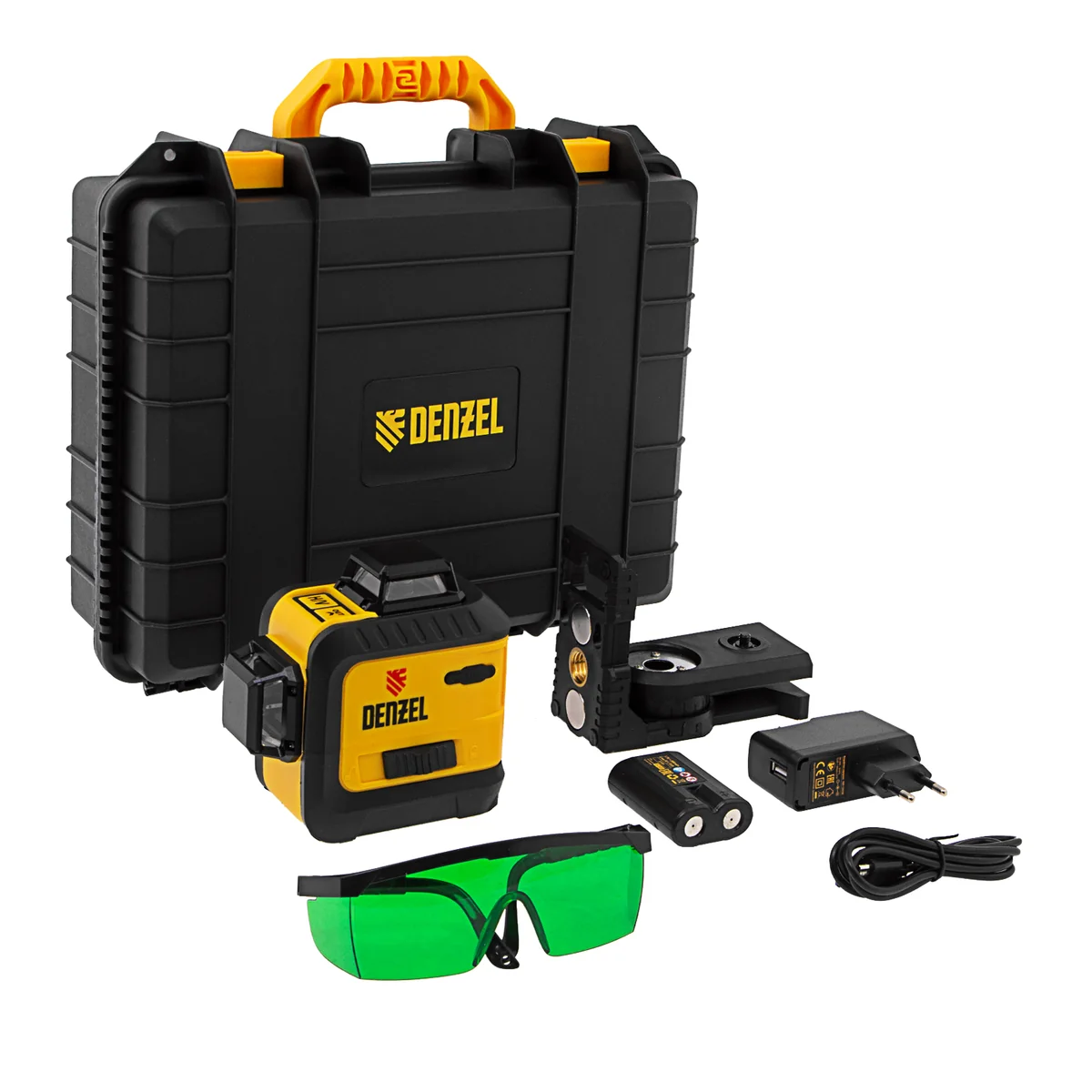 Мультипризменный лазерный уровень Denzel LXI 360-2 Green 35078 с резьбой под штатив 1/4"" проецирует 2 взаимно перпендикулярные линии с охватом в 360° на расстояние до 30 м при помощи зеленых лучей длиной 520 нм. Точность составляет ±0,3 мм/м. Уровень используется для построения разметки во время проведения отделочных и строительных работ. Подходит для площадки длиной до 60 м.ПреимуществаПростое управление — для работы с уровнем не требуются специальные знания и навыки.Возможность установки на штатив — в нижней части корпуса имеется резьба 1/4"".Точная разметка — уровень имеет функцию самовыравнивания, в случае отклонения по горизонтали более чем на 4° срабатывает световое оповещение.Построение разметки под углом — предусмотрена возможность отключения опции самовыравнивания.Яркие лучи — зеленые лазерные диоды Osram обеспечивают отличную видимость проекции даже при дневном освещении.Индикация уровня заряда — работа не прервется в неподходящий момент.Экономия заряда аккумулятора — неиспользуемые лучи можно отключать.Фиксация маятника — механизм самонивелирования защищен от повреждений во время транспортировки.Степень защиты IP54 — корпус из ударопрочного пластика не пропускает пыль и капли воды.Мобильность — прибор не зависит от наличия электророзетки, что позволяет брать его на выездные работы.Удобное хранение и транспортировка — компактный уровень упакован в надежный пластиковый кейс.Подтвержденное качество — гарантия на заводской брак действует 3 года.