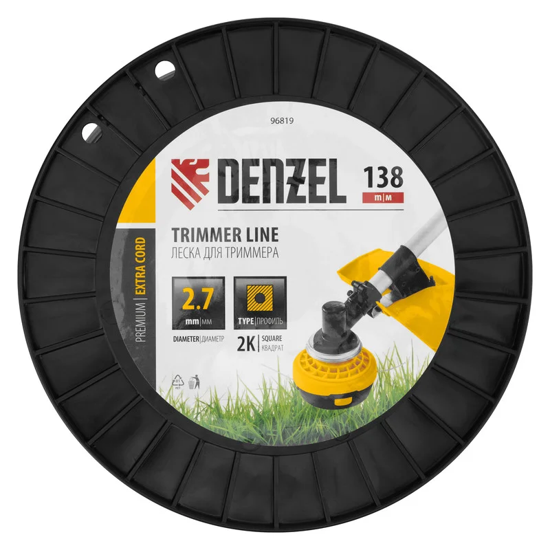 Двухкомпонентная леска для триммера Denzel EXTRA CORD 96819 размером 2,7 мм х 138 м, с сечением «квадрат», на DIN-катушке, используется для скашивания густых зарослей травы и сорных растений на дачном участке и придомовой территории. Заправляется в катушку бензокос с объемом двигателя 25-52 см3. Благодаря острым граням леска успешно справляется с толстыми, жесткими стеблями, позволяя быстро обработать участок большой площади.ПреимуществаПрочность — леска изготовлена из полиамида PA6 с использованием сырья производства компании BASF — признанного лидера мировой химической промышленности.Высокий ресурс — леска имеет прочный сердечник и эластичный внешний слой, что более чем на 50% увеличивает устойчивость к повреждениям и обрыву.Экономичность — длины 138 м достаточно для выполнения большого объема работ.Удобная упаковка — концы корда закрепляются в отверстиях DIN-катушки, чтобы сохранить целостность намотки во время хранения и транспортировки.