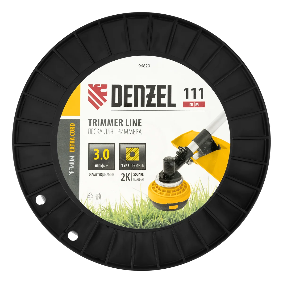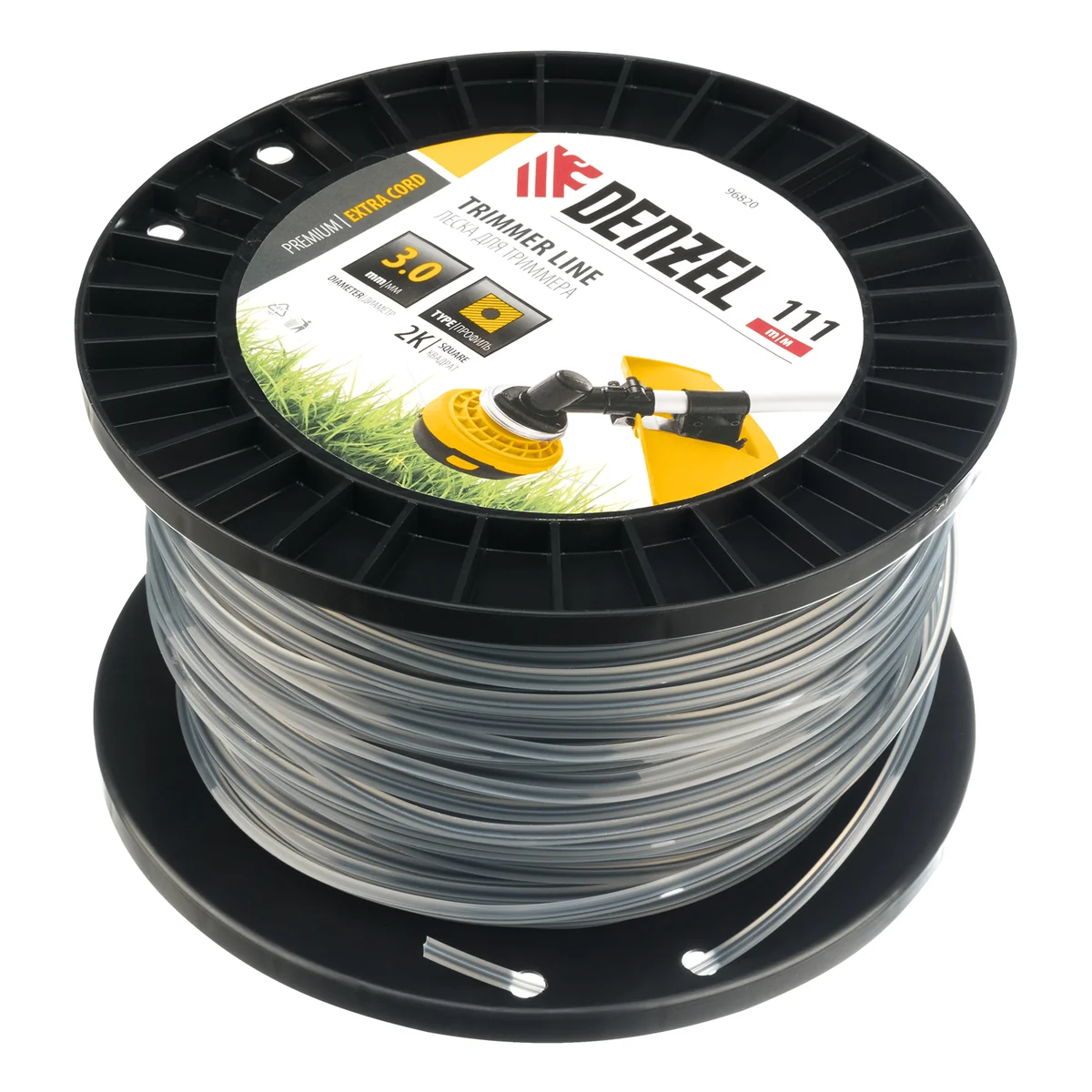Двухкомпонентная леска для триммера Denzel EXTRA CORD 96820 размером 3,0 мм х 111 м, с сечением «квадрат», на DIN-катушке, используется для скашивания густых зарослей травы и сорных растений на дачном участке и придомовой территории. Заправляется в катушку бензокос с объемом двигателя 25-52 см3. Благодаря острым граням леска успешно справляется с толстыми, жесткими стеблями, позволяя быстро обработать участок большой площади.