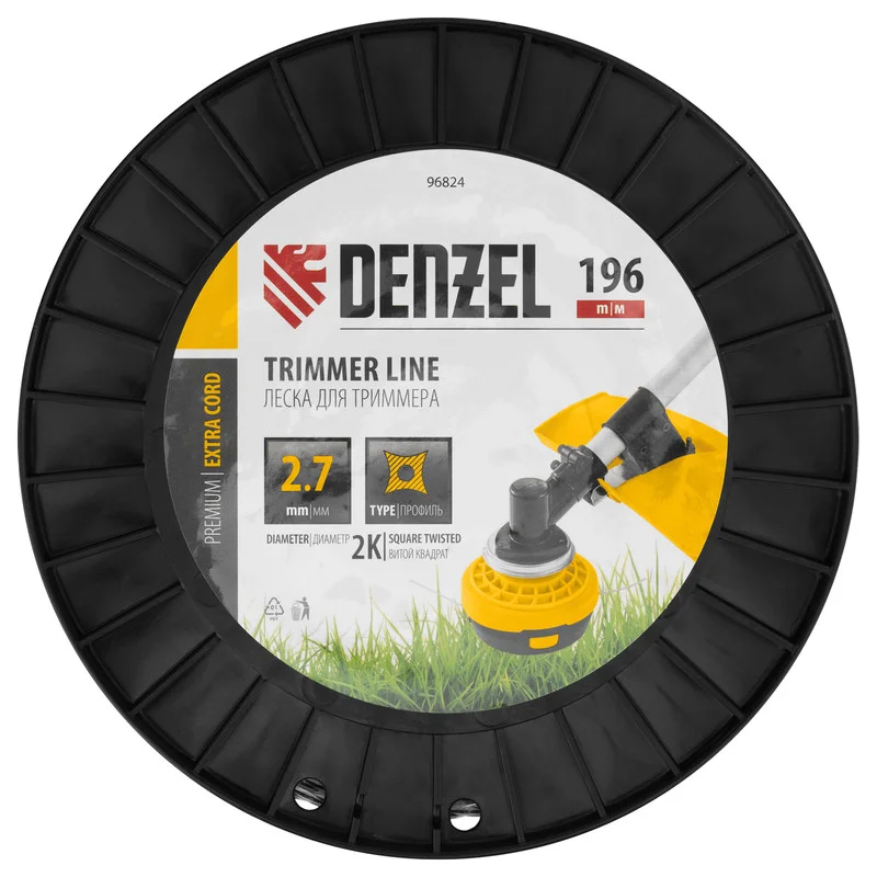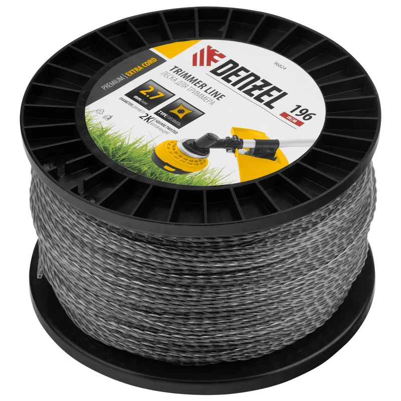Двухкомпонентная леска для триммера Denzel EXTRA CORD 96824 размером 2,7 мм х 196 м, с сечением «витой квадрат», на DIN-катушке, используется для скашивания густых зарослей травы и сорных растений на дачном участке и придомовой территории. Предназначена для бензотриммеров с объемом двигателя 25-52 см3. Устойчива к излому, что облегчает ее заправку в катушку. Благодаря острым граням леска успешно справляется с толстыми, жесткими стеблями, позволяя быстро обработать участок большой площади.ПреимуществаПрочность — леска изготовлена из полиамида PA6 с использованием сырья производства компании BASF — признанного лидера мировой химической промышленности.Высокий ресурс — леска имеет прочный сердечник и эластичный внешний слой, что более чем на 50% увеличивает устойчивость к повреждениям и обрыву.Экономичность — длины 196 м достаточно для выполнения большого объема работ.Удобная упаковка — концы корда закрепляются в отверстиях DIN-катушки, чтобы сохранить целостность намотки во время хранения и транспортировки.