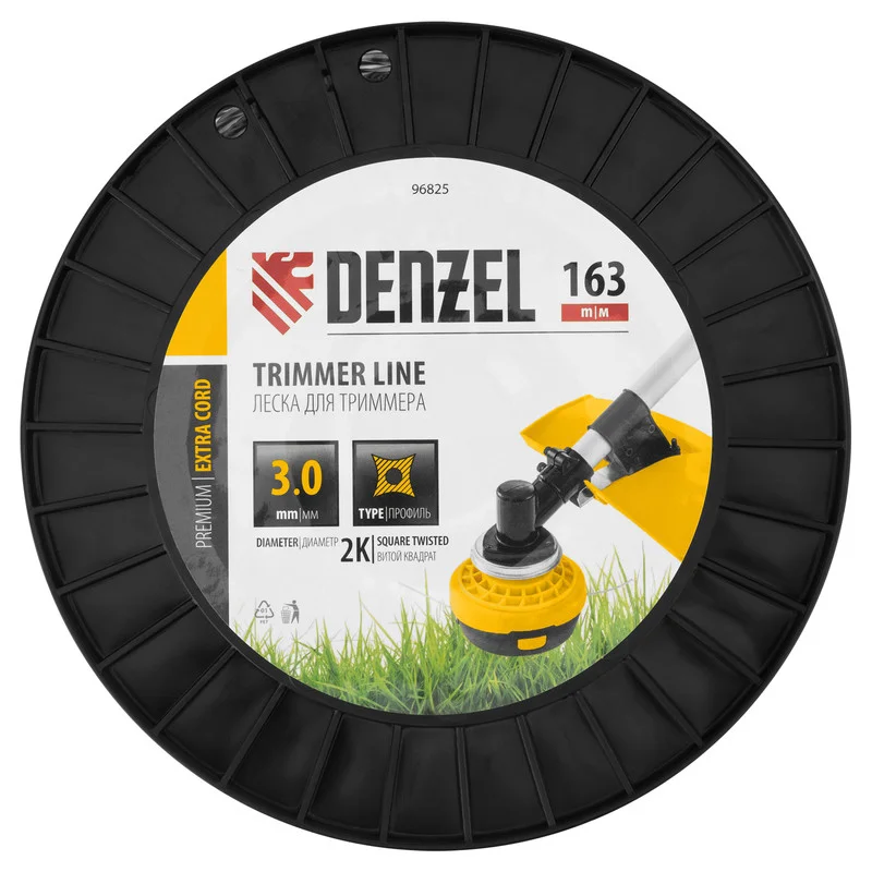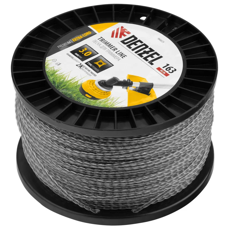 Двухкомпонентная леска для триммера Denzel EXTRA CORD 96825 размером 3,0 мм х 163 м, с сечением «витой квадрат», на DIN-катушке, используется для скашивания густых зарослей травы и сорных растений на дачном участке и придомовой территории. Предназначена для бензотриммеров с объемом двигателя 25-52 см3. Устойчива к излому, что облегчает ее заправку в катушку. Благодаря острым граням леска успешно справляется с толстыми, жесткими стеблями, позволяя быстро обработать участок большой площади.ПреимуществаПрочность — леска изготовлена из полиамида PA6 с использованием сырья производства компании BASF — признанного лидера мировой химической промышленности.Высокий ресурс — леска имеет прочный сердечник и эластичный внешний слой, что более чем на 50% увеличивает устойчивость к повреждениям и обрыву.Экономичность — длины 163 м достаточно для выполнения большого объема работ.Удобная упаковка — концы корда закрепляются в отверстиях DIN-катушки, чтобы сохранить целостность намотки во время хранения и транспортировки.
