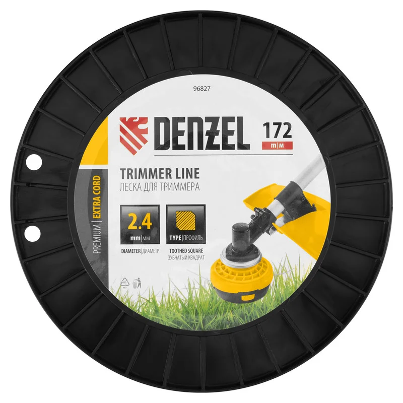 Двухкомпонентная леска для триммера Denzel EXTRA CORD 96827 размером 2,4 мм х 172 м, на DIN-катушке, имеет сечение «зубчатый квадрат», благодаря чему отличается повышенной агрессивностью реза. Эффективно скашивает густую траву и сорные растения с толстыми жесткими стеблями. Совместима с электротриммерами и бензокосами с объемом двигателя 25-52 см3. Леска подходит для ухода за газоном на дачном участке, в парках, скверах, на придомовой территории.ПреимуществаПрочность — леска изготовлена из полиамида PA6 с использованием сырья производства компании BASF — признанного лидера мировой химической промышленности.Высокий ресурс — леска имеет прочный сердечник и эластичный внешний слой, что более чем на 50% увеличивает устойчивость к повреждениям и обрыву.Экономичность — длины 172 м достаточно для выполнения большого объема работ.Удобная упаковка — концы корда закрепляются в отверстиях DIN-катушки, чтобы сохранить целостность намотки во время хранения и транспортировки.