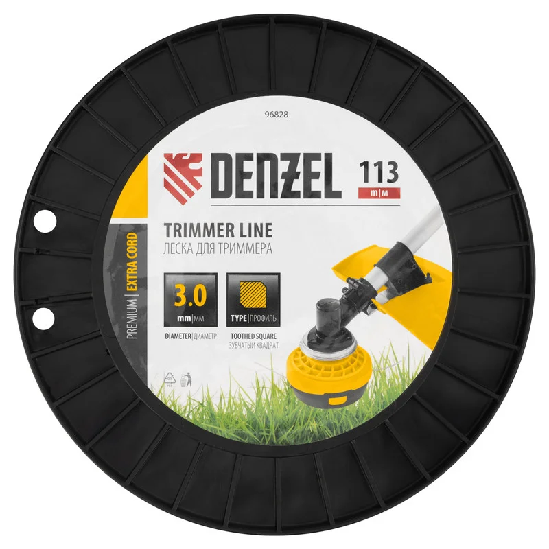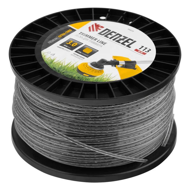Двухкомпонентная леска для триммера Denzel EXTRA CORD 96828 размером 3,0 мм х 113 м, на DIN-катушке, имеет сечение «зубчатый квадрат», благодаря чему отличается повышенной агрессивностью реза. Эффективно скашивает густую траву и сорные растения с толстыми жесткими стеблями. Совместима с бензокосами с объемом двигателя 25-52 см3. Леска подходит для ухода за газоном на дачном участке, в парках, скверах, на придомовой территории.ПреимуществаПрочность — леска изготовлена из полиамида PA6 с использованием сырья производства компании BASF — признанного лидера мировой химической промышленности.Высокий ресурс — леска имеет прочный сердечник и эластичный внешний слой, что более чем на 50% увеличивает устойчивость к повреждениям и обрыву.Экономичность — длины 113 м достаточно для выполнения большого объема работ.Удобная упаковка — концы корда закрепляются в отверстиях DIN-катушки, чтобы сохранить целостность намотки во время хранения и транспортировки.