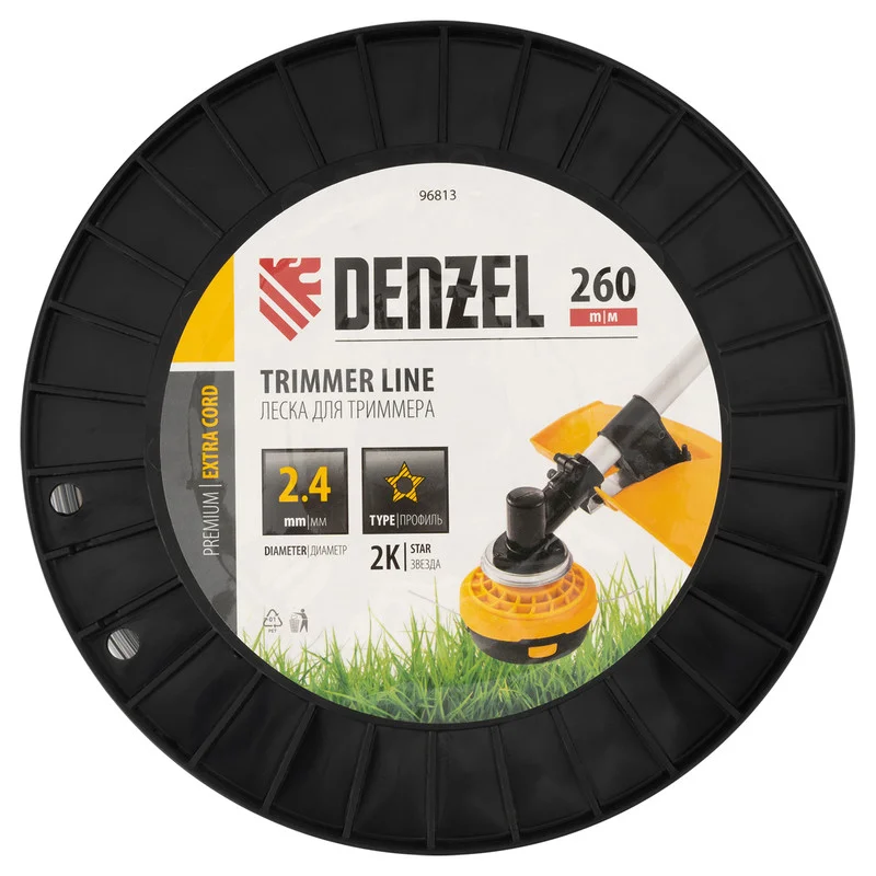 Двухкомпонентная леска для триммера Denzel EXTRA CORD 96813 размером 2,4 х 260 м, с сечением «звезда», поставляется на DIN-катушке и предназначена для скашивания плотных зарослей травы и растений с жесткими стеблями. Заправляется в катушку электротриммеров и бензокос с объемом двигателя 25-52 см3. Обеспечивает агрессивный рез и высокую производительность. Леска пригодится владельцам загородных участков и сотрудникам коммунальных служб.ПреимуществаПрочность — леска изготовлена из полиамида PA6 с использованием сырья производства компании BASF — признанного лидера мировой химической промышленности.Высокий ресурс — леска имеет прочный сердечник и эластичный внешний слой, что более чем на 50% увеличивает устойчивость к повреждениям и обрыву.Экономичность — длины 260 м достаточно для выполнения большого объема работ.Удобная упаковка — концы корда закрепляются в отверстиях DIN-катушки, чтобы сохранить целостность намотки во время хранения и транспортировки.