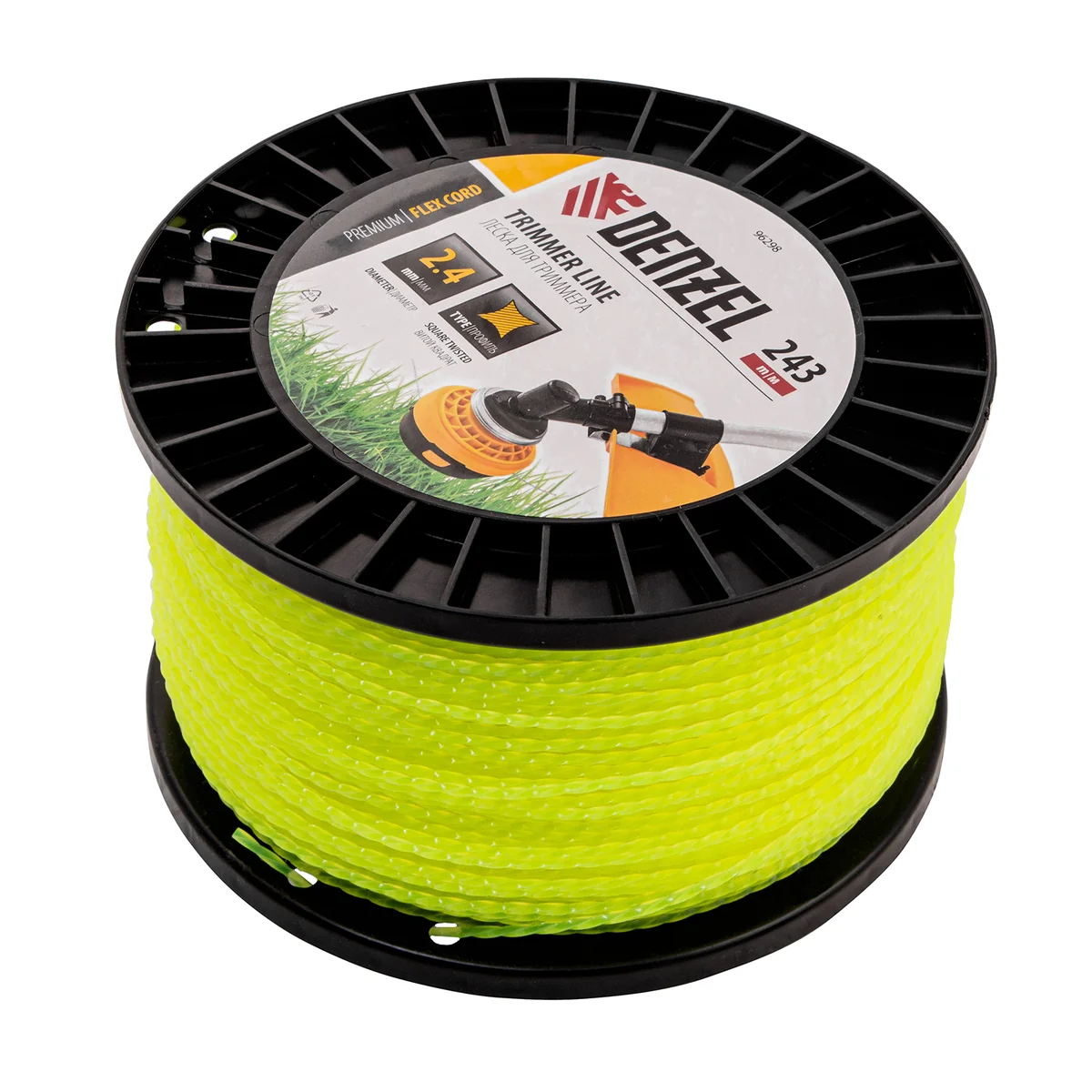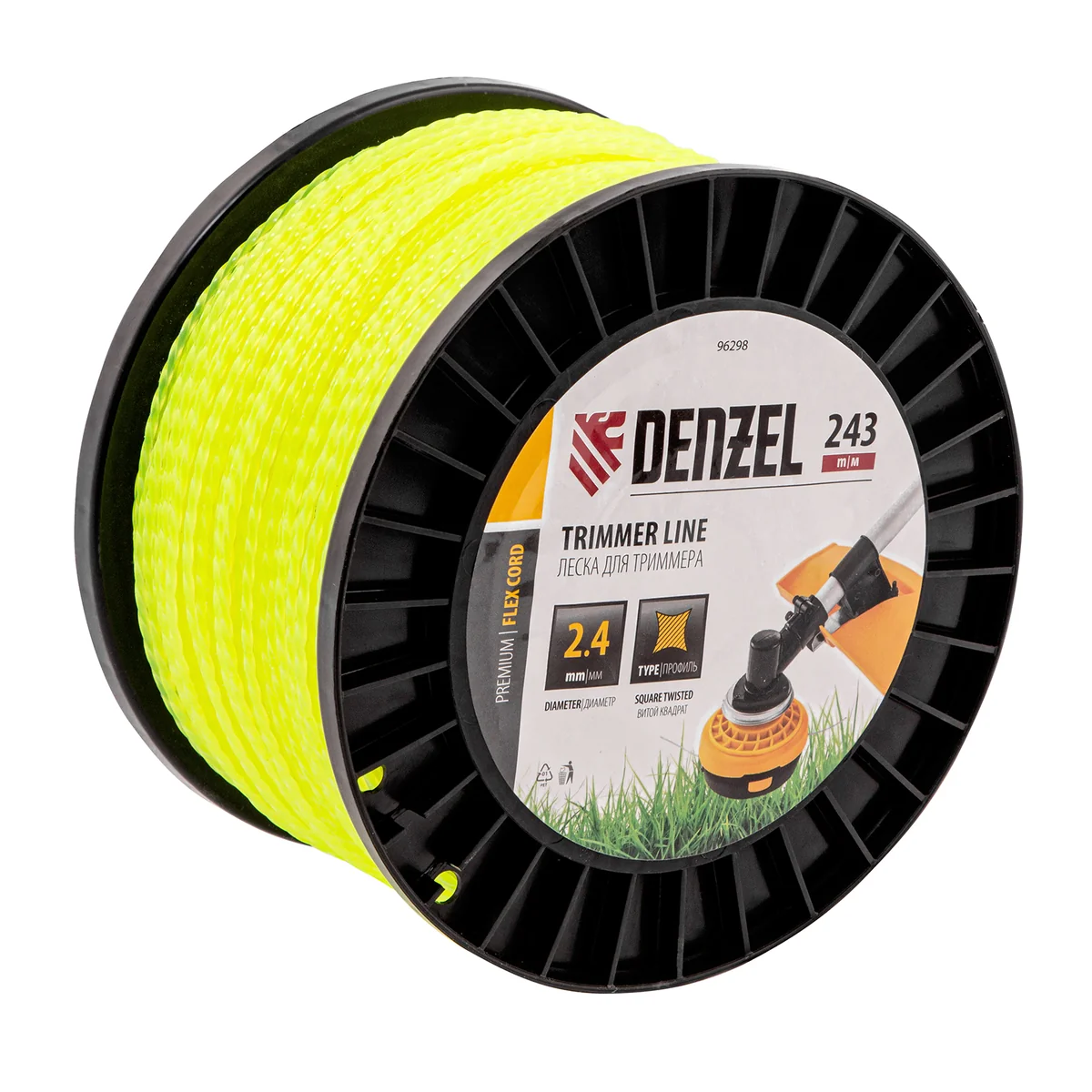 Леска для триммера Denzel FLEX CORD 96298 с сечением «витой квадрат», толщиной 2,4 мм и длиной 243 м, на DIN-катушке, предназначена для скашивания крупностеблевой растительности. Используется на бензиновых триммерах с объемом двигателя 25-52 см3 и электротриммерах мощностью от 1 до 1,5 кВт.ПреимуществаПрочность и долговечность — леска изготовлена из полиамида РА6 с добавлением полиамида BASF.Высокая скорость работы — леска с острыми гранями производит агрессивный рез, быстро скашивая траву.Комфортное использование — за счет сечения «витой квадрат» корд обладает хорошей эластичностью и его удобно наматывать на катушку.Длина 243 м — запаса хватит на длительный срок.Удобное хранение и транспортировка — корд не размотается, если его концы закрепить в специальных отверстиях DIN-катушки.