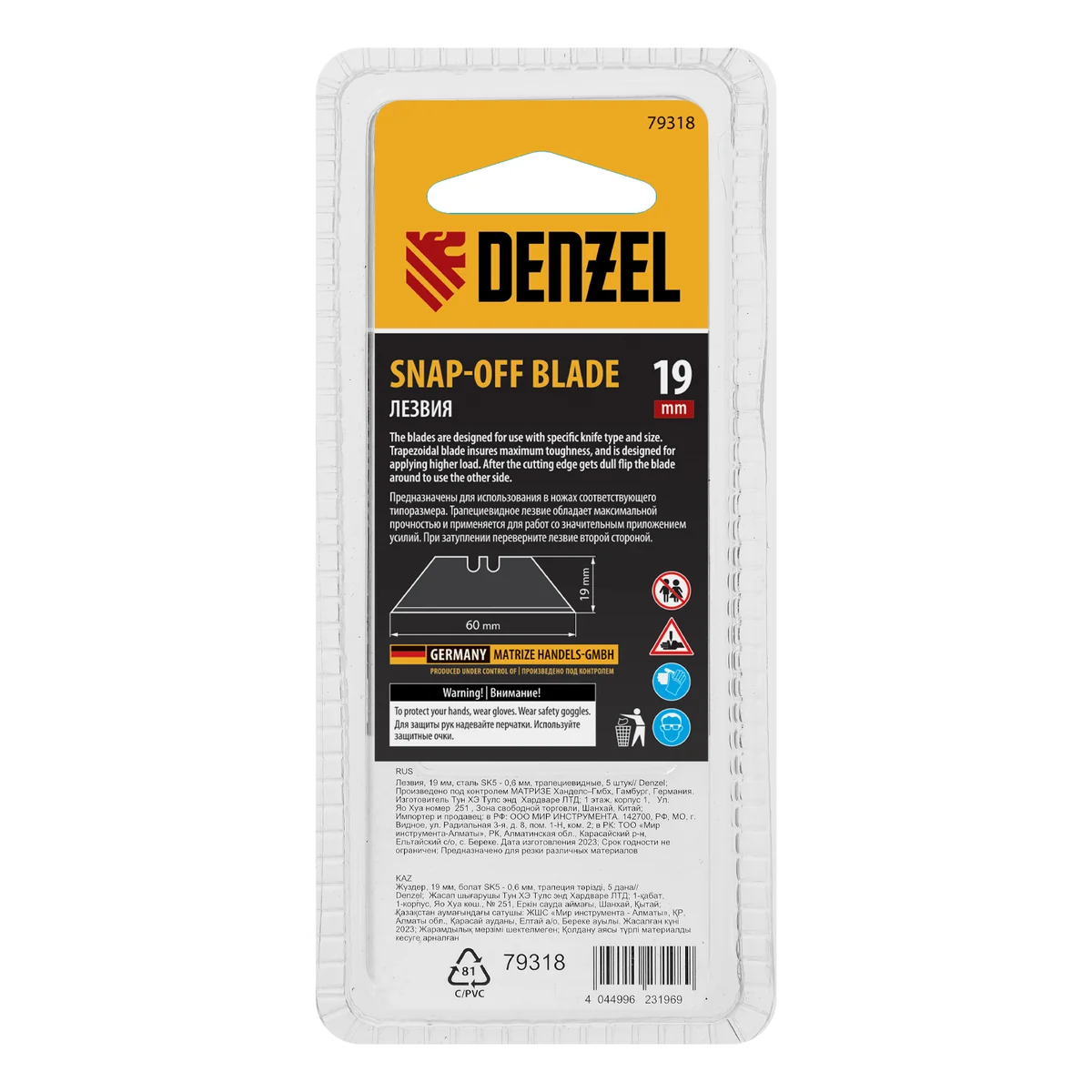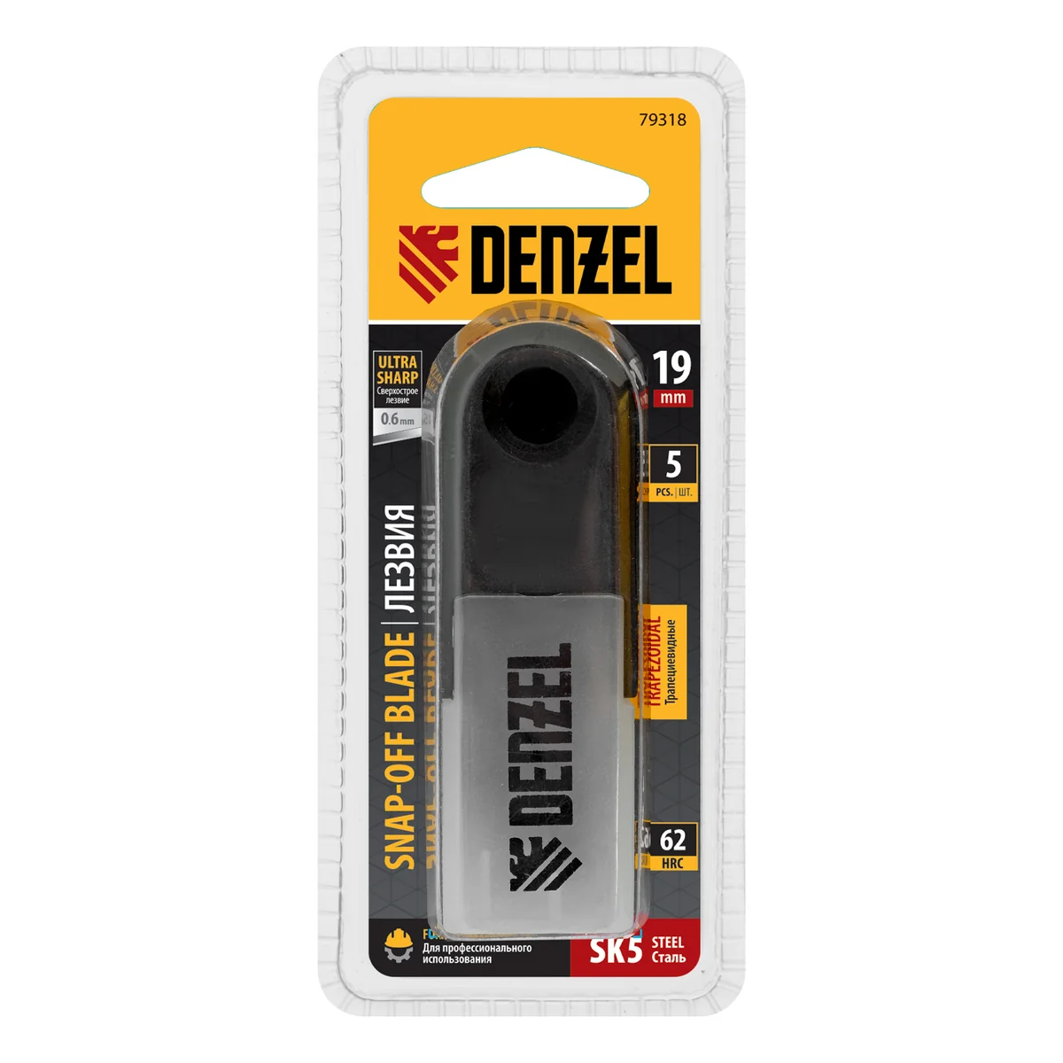 Трапециевидные лезвия Denzel 79318 шириной 19 мм, изготовленные из стали SK5 толщиной 0,6 мм, 5 шт. в упаковке, — сменные элементы для строительных ножей. Подходят для разрезания линолеума, картона, пластика, гипсокартона, раскройки обоев. Отличаются повышенной прочностью и долговечностью по сравнению с аналогами других торговых марок. Сменные полотна используются в профессиональной и бытовой сфере.
