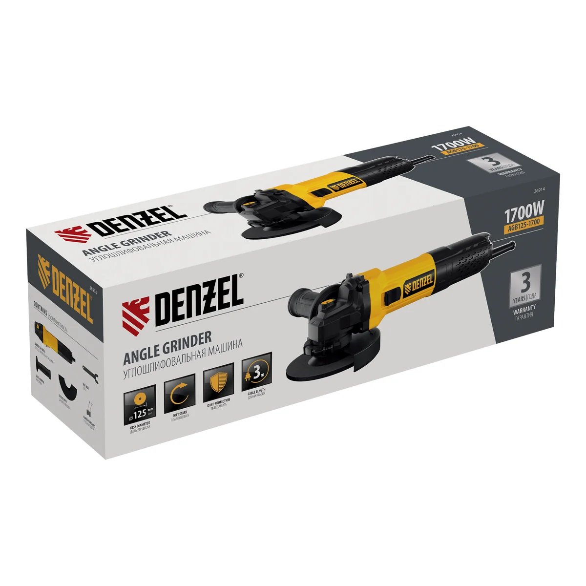 Угловая шлифовальная машина Denzel AGB-125-1700 26914 мощностью 1700 Вт используется для выполнения отрезных, зачистных и шлифовальных работ с металлическими заготовками при помощи абразивных кругов и проволочных щеток. Совместима с оснасткой диаметром 125 мм, имеет функцию поддержания оборотов под нагрузкой, частота вращения шпинделя составляет 3000-11000 об/мин. Система пылезащиты двигателя позволяет работать по бетону и камню.