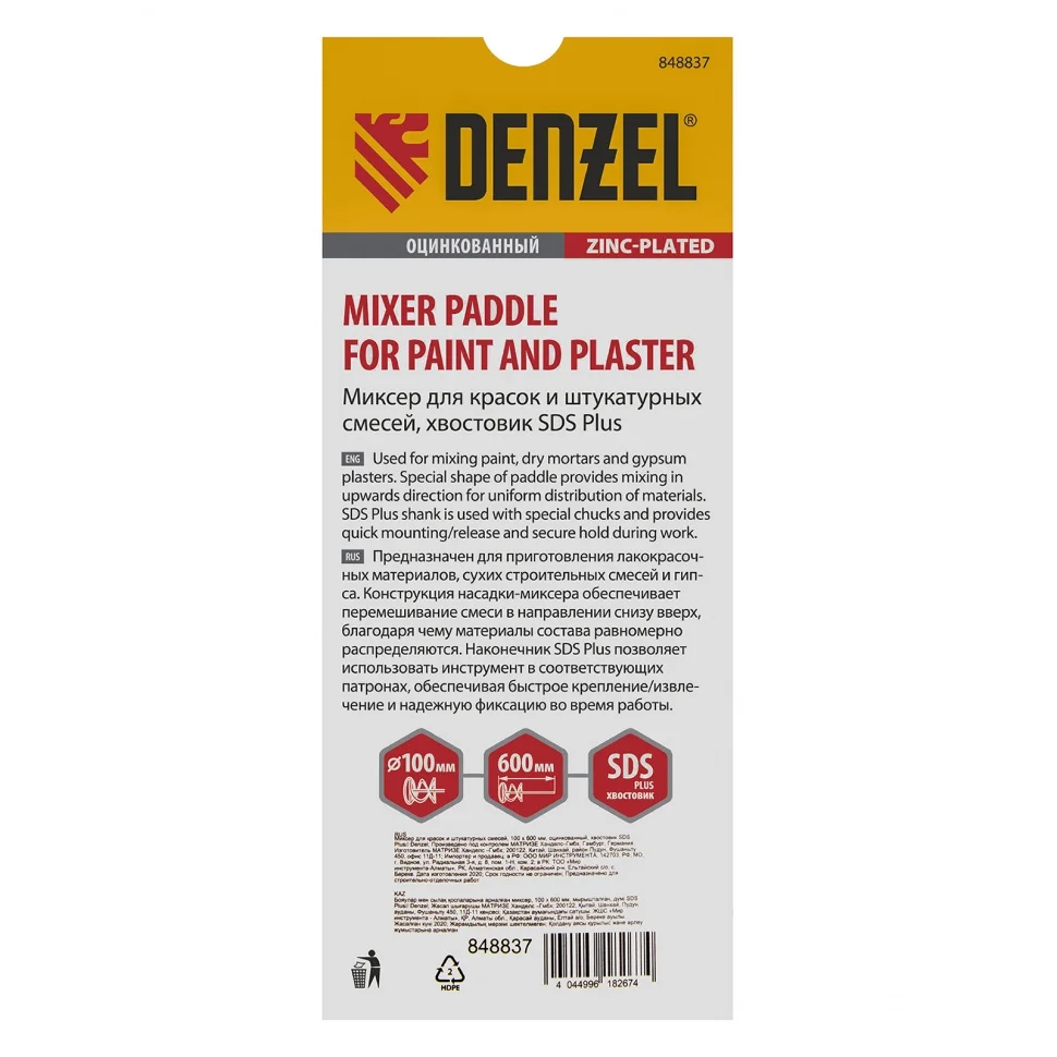Оцинкованный миксер для красок и штукатурных смесей Denzel 848837, 100 х 600 мм, с хвостовиком SDS Plus, используется для замешивания строительных растворов. Спиралевидная рабочая часть перемешивает состав снизу вверх, поэтому все компоненты распределяются в нем равномерно. Защитное кольцо предотвращает повреждение емкости для размешивания состава. Штукатурный миксер устанавливается в патрон перфоратора SDS Plus и применяется во время строительных и отделочных работ.ПреимуществаПрочная сварная конструкция стального миксера не деформируется под действием динамических нагрузок и рассчитана на интенсивное применение.Насадка-миксер оцинкована, поэтому устойчива к коррозии и механическим повреждениям.Хвостовик SDS Plus позволяет быстро устанавливать миксер в патрон перфоратора и обеспечивает его надежную фиксацию во время работы.