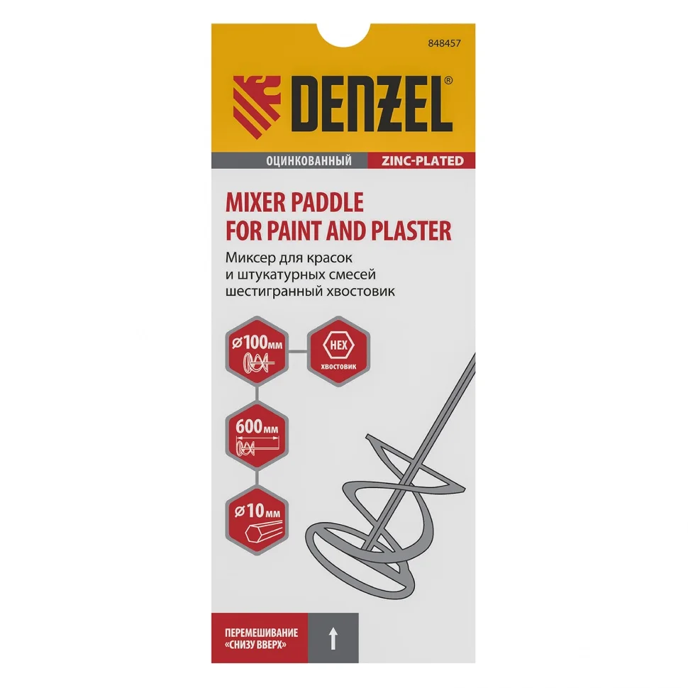 Миксер для красок и штукатурных смесей, 100 х 600 мм, оцинкованный, шестигранный хвостовик 10мм Denzel 848457