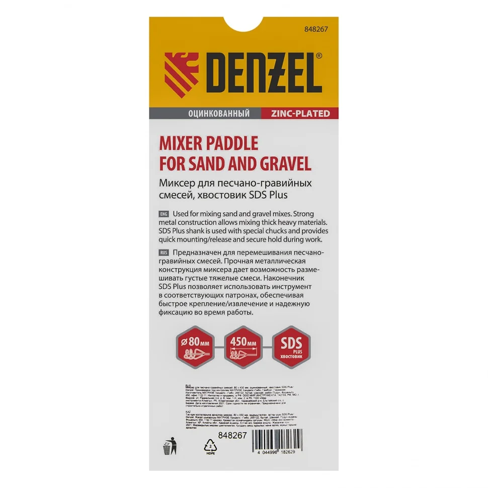 Миксер для песчано-гравийных смесей, 80 х 450 мм, оцинкованный, хвостовик SDS Plus Denzel 848267