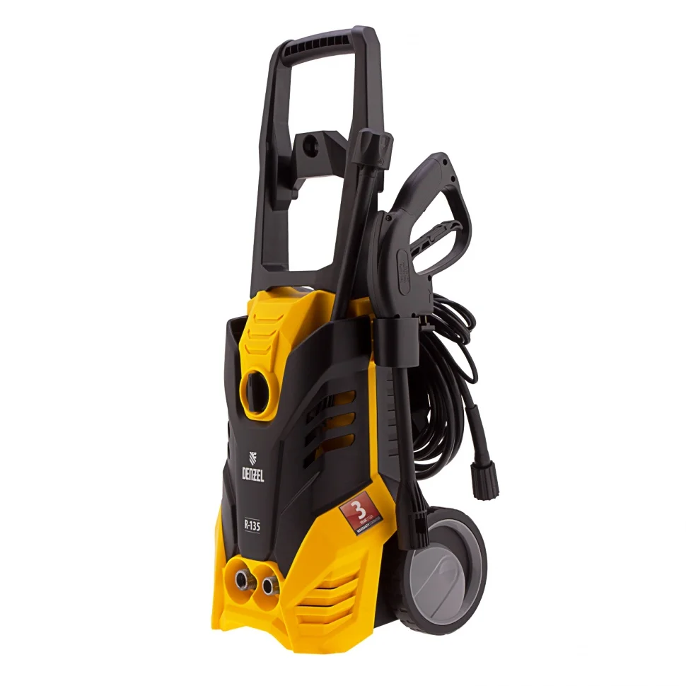 Колесная моечная машина высокого давления Denzel R-135 58233 производительностью 6 л/мин, мощностью 1800 Вт, с максимальным давлением 135 бар, используется для мытья автомобилей, садового инвентаря, велосипедов, дорожек и заборов. Мощный мотор и помпа высокой производительности позволяют быстро справляться даже с серьезными загрязнениями. Если нет доступа к водопроводу, мойка может осуществлять забор воды из резервуара в режиме самовсасывания, теряя при этом всего 5% давления.