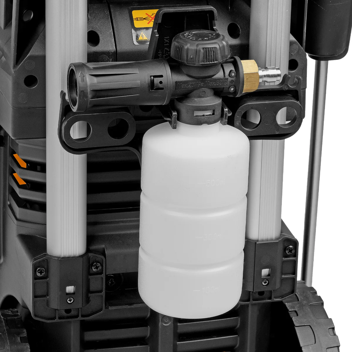 - Максимально эффективное очищение — к мойке прилагается внешний пенокомплект с функцией улучшенного пенообразования, быстросъемное крепление позволяет устанавливать его на пистолет одним движением.