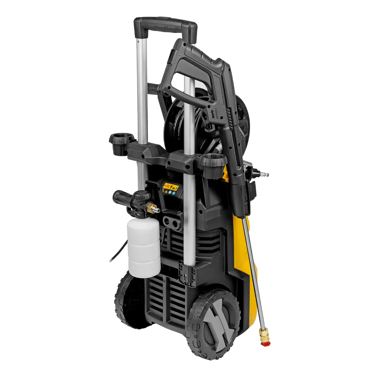 - Мойка высокого давления, Барабан для шланга (установлен), Шланг высокого давления (установлен), Пистолет, Удлинитель пистолета, Сменные сопла 3 шт, Пеногенератор с бачком для моющего средства, Входной штуцер с фильтром, Быстросъемный коннектор шланга, кронштейн-держатель пистолета, Кронштей сетевого кабеля, Игла для прочистки сопла, Комплект крепежа, Инструкция с гарантийным талоном