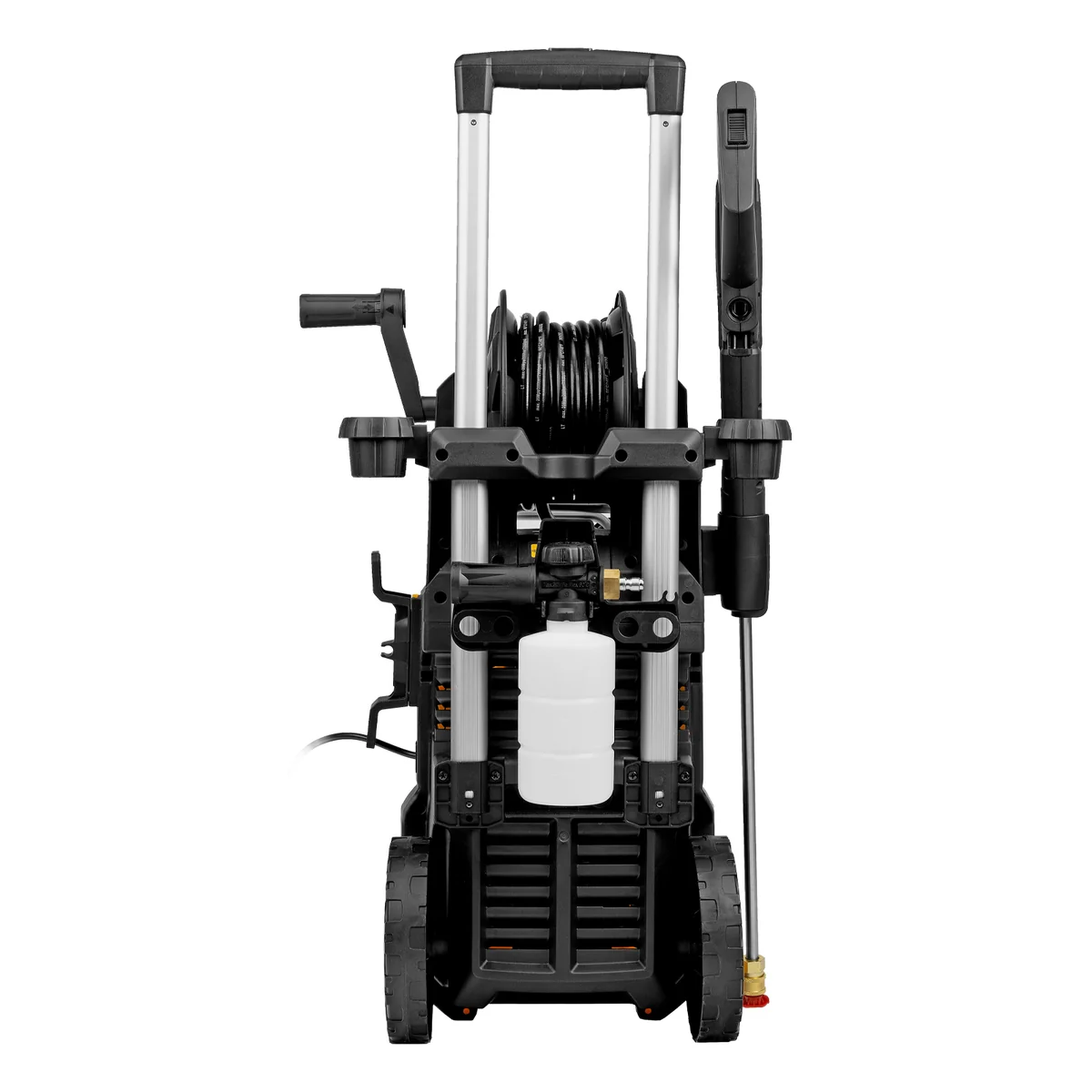 - Максимально комфортное передвижение — длина шнура питания составляет 5 м, длина шланга высокого давления увеличена до 8 м.